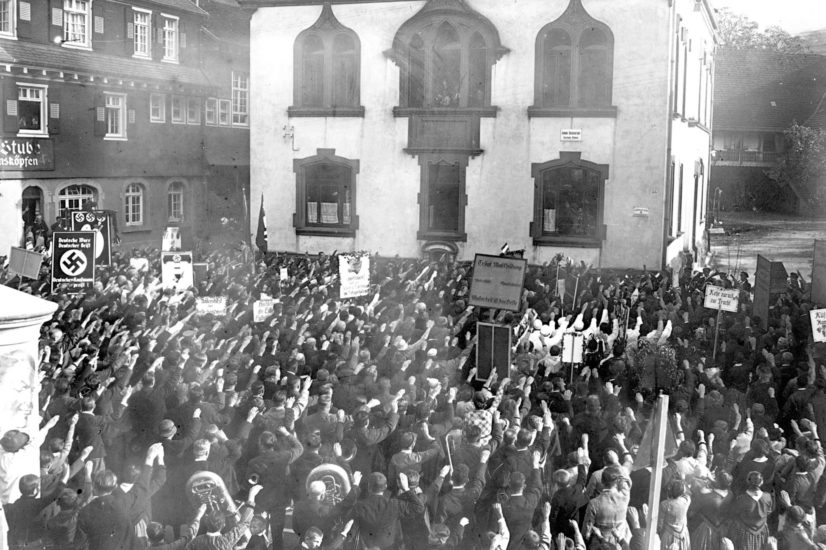 Die Bäcker sind in ihrer Berufskleidung (weiß gekleidete Personen) erschienen. Die Musiker an der rechten Rathausecke spielen gerade (»Die Fahne hoch«? Nationalhymne?), während die Bevölkerung, »stramm auf Linie getrimmt« den rechten Arm zum »deutschen Gruß« erhoben hat. Hinter dem rechten Rathausfenster grüßt der Bürgermeister.