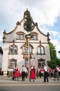 Über zwei Dutzend Zimmerleute – unter ihnen mit Katja Rombach auch eine Zimmerin – führten unter den Klängen des Spielmanns- und Fanfarenzuges und in Begleitung der Trachtentanzgruppe den 18 Meter langen Maibaum durch das Dorf zum Rathausplatz. Unter der fachkundigen Anleitung von Klaus Lehmann und Rolf Rombach richteten die Zimmerleute mit Muskelkraft den geschmückten Maibaum auf. Die Trachtentanzgruppe, begleitet von Elfriede Lehmann und Herbert Jilg auf dem Akkordeon, feierte das Aufstellen vor dem Rathaus mit Tänzen rund um den Maibaum, der Spielmanns- und Fanfarenzug spielte mehrere Märsche.