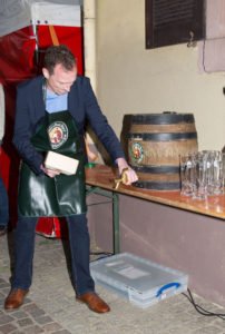 Bürgermeister Richard Weith, der zum ersten Mal diese Zeremonie verfolgte, freute sich über das Engagement des WKO. »Ich darf mich mit einem flüssigen Geschenk von der gar nicht mehr so flüssigen Gemeinde bei allen Beteiligten bedanken«, lud er Zimmerleute sowie Trachten- und Uniformträger zum Umtrunk ein. Moderator Felix Huber, der vor Jahresfrist den Zapfhahn beim Fassanstich hielt und dem dabei ordentlich auf die Finger geklopft wurde, hielt sich dezent zurück, als Bürgermeister Richard Weith mit drei Schlägen das Freibier fließen ließ. Und wäre der Hahn geschlossen gewesen, hätte er nicht einen einzigen Tropfen vergeudet.