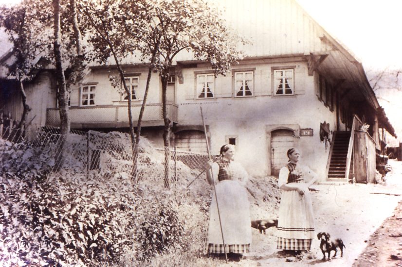 Lösung: Unser Bild zeigt den Hinterbauerhof im Holdersbach (»’s Hintere Bure«). Das Bild wurde in den 1920er Jahren aufgenommen. Vor dem Hof stehen (vermutlich) die jüngste Tochter Maria Cäcilia (rechts), die Severin Schnaiter heiratete und auf den Fußbühl zog. Neben ihr steht Maria Justina, die ledig blieb. Die zwei Jagdhunde sind namentlich nicht mehr festzustellen.