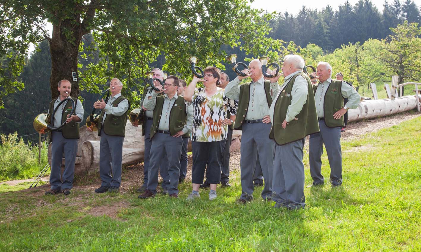 Am Sonntagmorgen hatte sich unweit des Hubhofes am »Vesperweg« bei der 30 Meter langen Baumstammbank die Jagdhornbläsergruppe Harmersbachtal aufgestellt. Unter der Leitung von Willi Hug begrüßten die zehn Bläser, verstärkt durch eine Frau, nicht nur den warmen Frühlingstag mit Märschen und kurzen Signalen. Etliche Wanderer, die die Route des Vesperweges ausgewählt hatten, nutzten nach dem ersten steilen Anstieg das musikalische Angebot für eine kurze Verschnaufpause und sparten auch nicht mit Applaus für die abwechslungsreichen Einlagen.