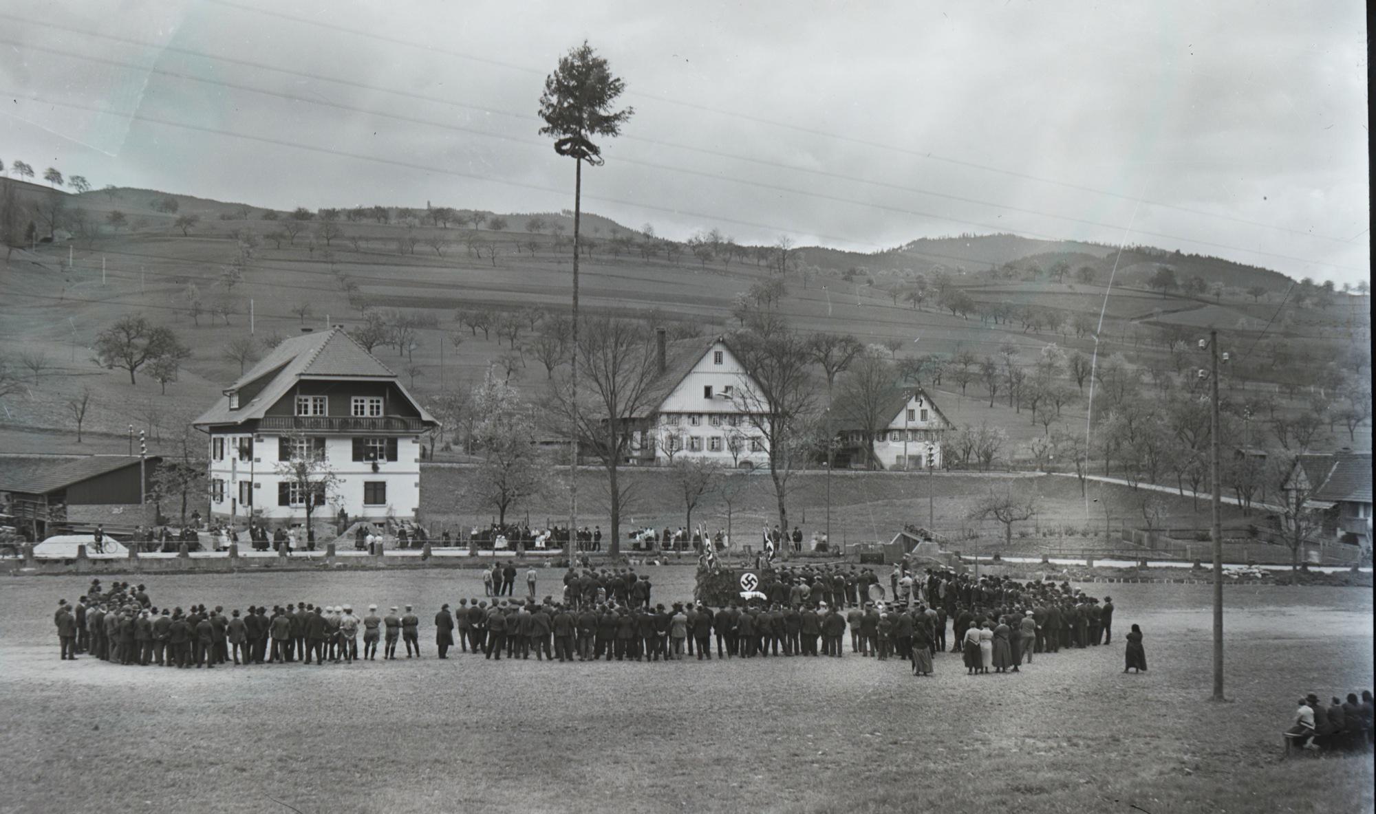 Lösung: Das Bild stammt aus den 1930er Jahren. Links steht das Haus Lehmann, im Hintergrund sieht man »s’Lukasse-Bure« mit dem »Libdig«-Gebäude. Auf dem damaligen Sportplatz hatten die Nationalsozialisten zur »Sonnwendfeier« eingeladen (von 1933 – 1944 immer am 23. Juni abgehalten). Rednertribüne und Maibaum waren unverzichtbare »Zutaten« für dieses jährlich wiederkehrende Ritual. Es war eine Pflichtveranstaltung vor allem für die HJ (Hitler-Jugend).