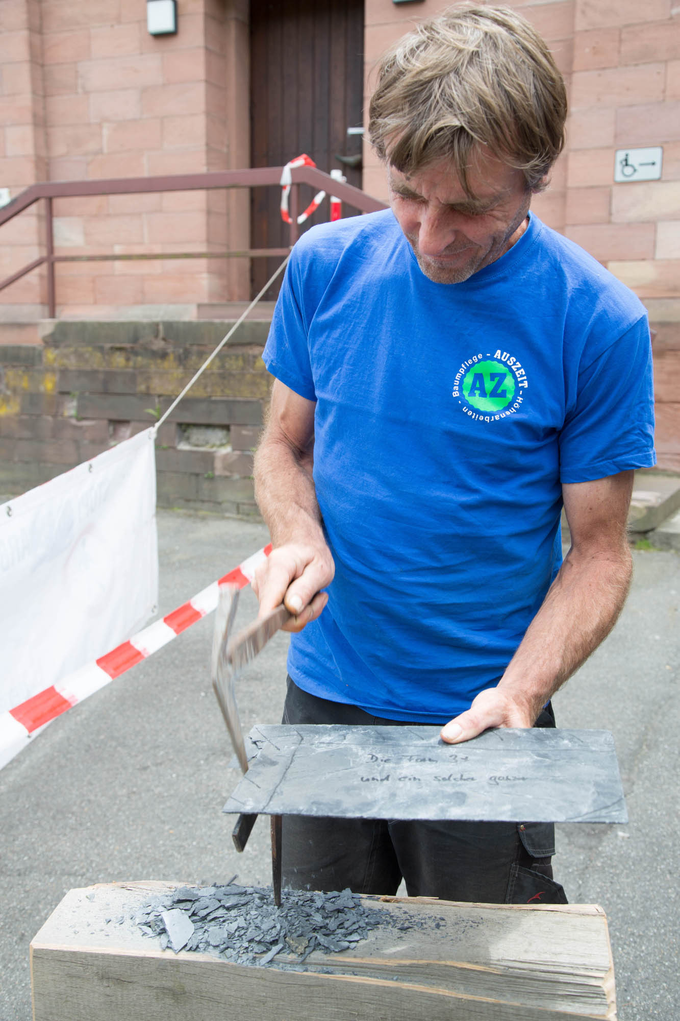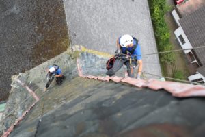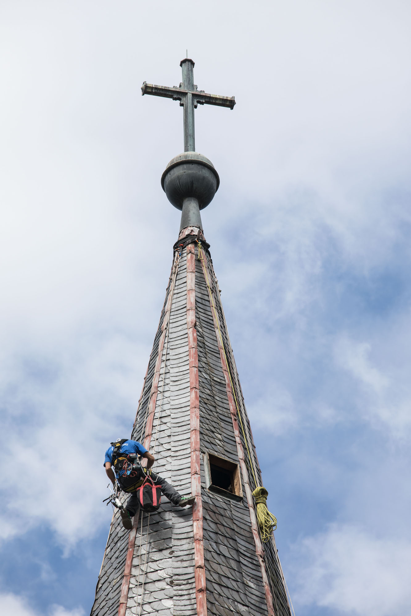 Umfangreiche Vorkehrungen müssen getroffen werden. Ganz oben an der Kirchturmspitze legt Tim Vollhardt eine Schlaufe, um vom Ausstieg durch eine Luke fünf Meter unter dem Kreuz alle Seiten des Turmhelms zu erreichen. Erst dann beginnen die Sanierungsarbeiten. Das eingespielte Team zeigt eine reibungslose Kommunikation zwischen »Bodenstation« und dem Himmel nahen Arbeitsplatz. Während Harald Vollhardt an der Haubrücke mit dem Schieferhammer nach Vorgabe die Schindeln passend richtet, bereiten Tim Vollhardt und sein Mitarbeiter Niklas Dormanns den Aufstieg vor.