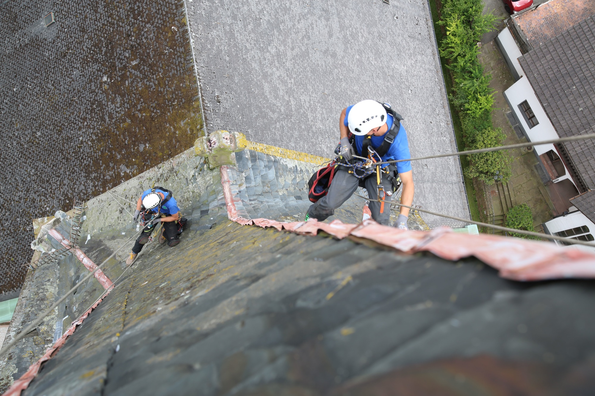 Jeder Handgriff sitzt, als Niklas sein Fanggeschirr anlegt, doppelte Sicherung eben. Jedes Arbeitsgerät wird zusätzlich angebunden. Während er sich durch die enge Luke zu seinem Arbeitsplatz zwängt, keucht Tim die letzte Leiter empor, mit zwei großen Taschen, als käme er vom Wochenendeinkauf aus dem Supermarkt: Schindeln für die anstehenden Reparaturen. Kurze Zeit später hängen beide an ihren Sicherungsseilen außen am Turmhelm. Die Aussicht von hier oben ist für die beiden Kletterer Nebensache. Sie müssen sich auf das Auswechseln der schadhaften Schieferschindeln und die neuerliche