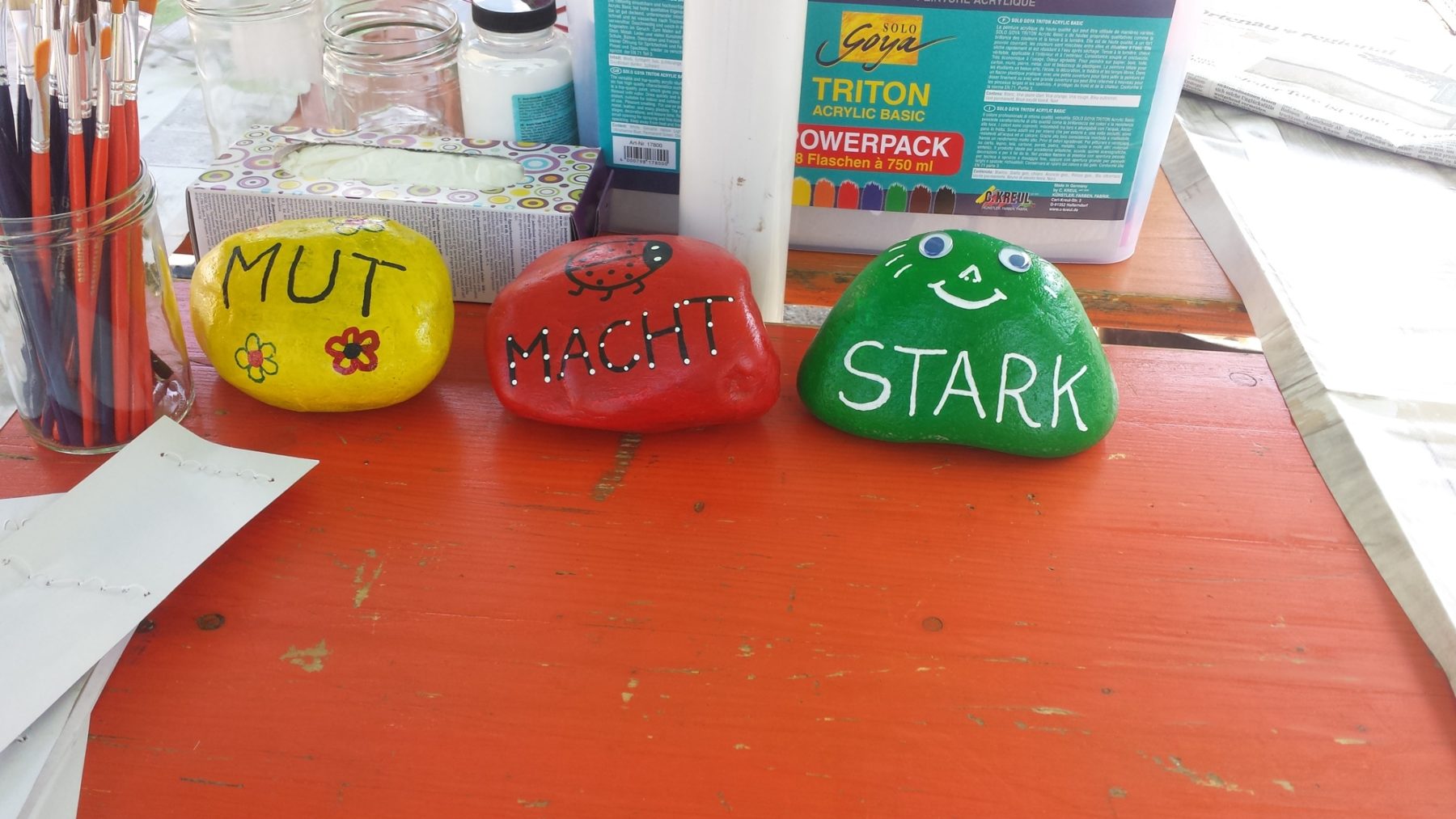 Auch den Kindern hat es offensichtlich gut gefallen. Das Kistenstapeln in der Halle fand viele »Anhänger«, am Hundeparcours bildeten sich zeitweise längere Schlangen. Jeder wollte einmal Setter-Dame »Lilly« streicheln, mit dem temperamentvollen »Sammy« spielen oder mit der gemütlichen Beagle-Hündin »Nele« den Parcours absolvieren. Der Tisch, an dem Glücksbringer gebastelt werden konnten, war öfters überfüllt. Anja Weith berichtet, dass ihr Aktionstisch viereinhalb Stunden ununterbrochen belegt war. »Nach der ersten halben Stunde habe ich aufgehört die Kinder zu zählen«, erinnert sie sich. Rund 60 Steine wurden bemalt, darunter viele Glückskäfer, Schmetterlinge, Blumenmuster und lustige Monster mit Wackelaugen. Viele Eltern und sogar Großeltern haben tatkräftig mitgeholfen. Für viele Kids war das Reiten das Highlight und auch das Angebot der Jugendfeuerwehr, mit Schlauch und Wasser, fand bei den hochsommerlichen Temperaturen viele Fans.