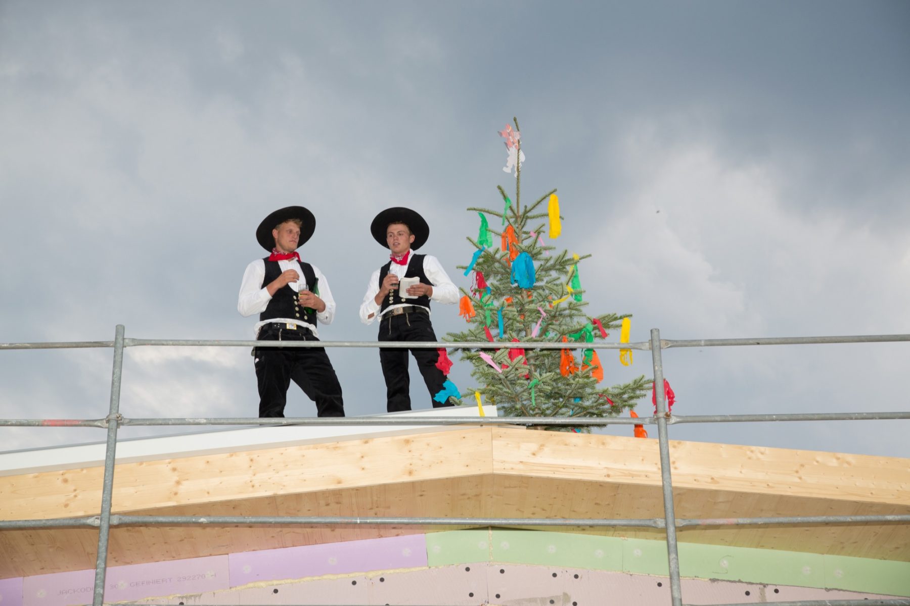 Wichtige Etappe: Während Anton Uhl (links) assistierte, hielt Junggeselle Jannik Kienast den Richtspruch. Foto: Lehmann-Archiv