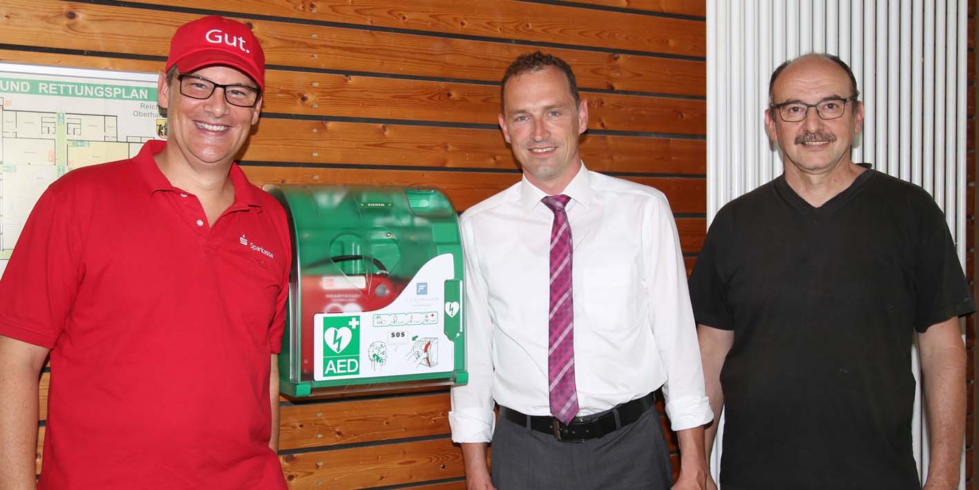 Seit Dienstag hängt neben der Aufgangstreppe zur Reichstalhalle ein Defibrillator, den die Sparkasse Haslach-Zell stiftete. Vorstandsvorsitzender Bernd Jacobs übergab das lebensrettende Gerät Bürgermeister Richard Weith.