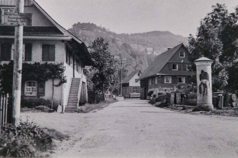 Lösung: Das Bild zeigt eine Momentaufnahme Ende der1930er/Anfang 1940er Jahre im Ortsteil Riersbach. Stromleitungsmasten entlang der Straßen zählten damals noch zum Ortsbild. Am Mast ganz links, ist ein Hinweisschild in Frakturschrift (mit Mühe ist im Original als Wort unten rechts »Hark« zu entziffern), was auf die Vorkriegszeit hindeutet. Die linke Hälfte dominiert das Haus »’s Hellingers« (1982 umgebaut). Bei genauem Hinschauen ist oberhalb der Dachkante der Aussichtspavillon an der linken Talseite zum Holdersbach zu erkennen.