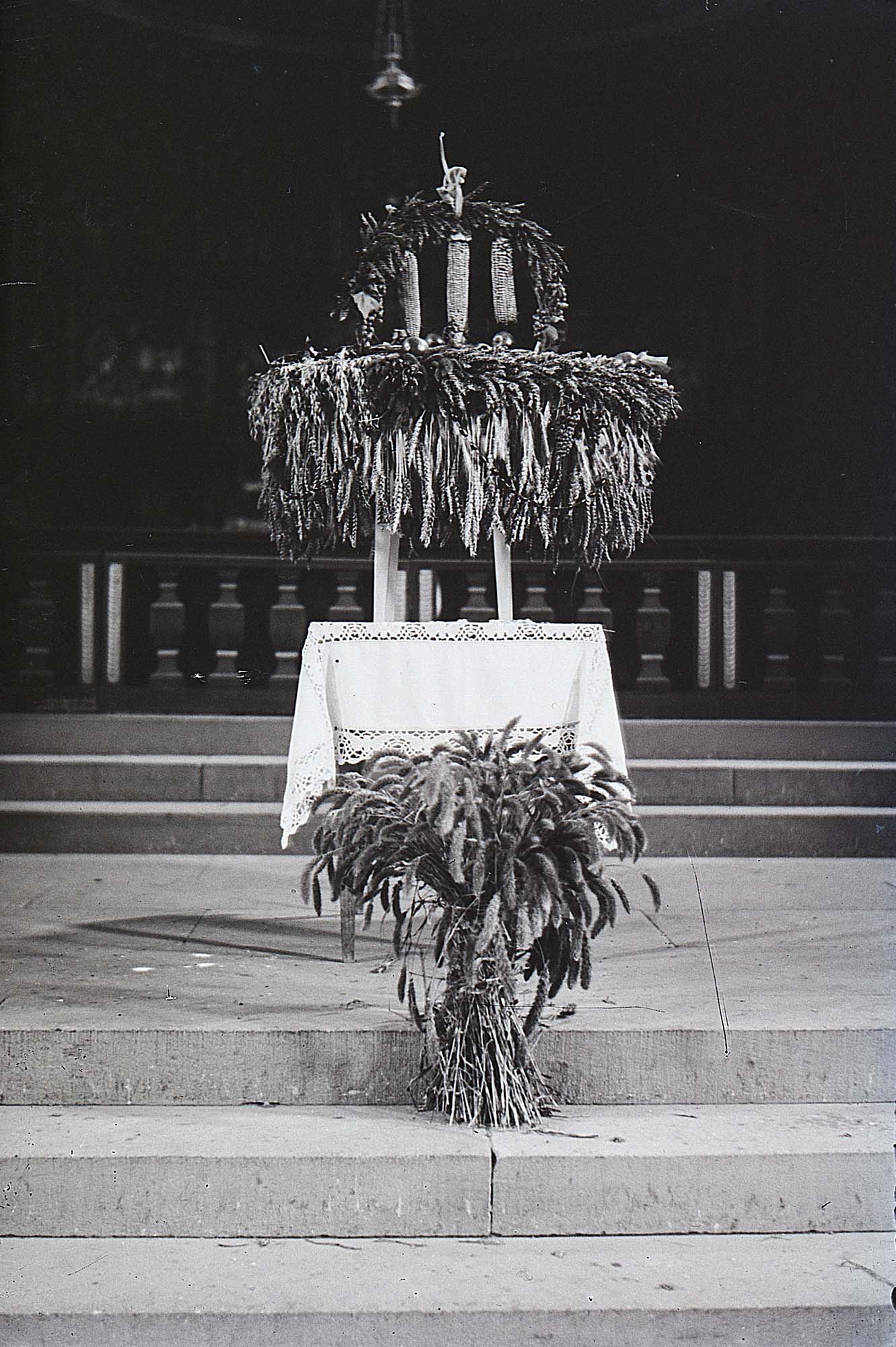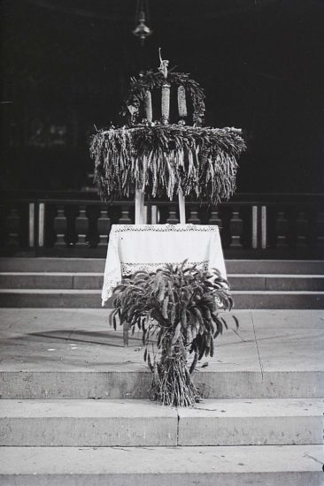 Lösung: Das Bild entstand Ende der 1920er Jahre (1928 oder 1929) in der Pfarrkirche St. Gallus Oberharmersbach. Vor den Stufen zum Altar (im Hintergrund ist noch die im Zuge der »Totalrenovierung« der Pfarrkirche beseitigte Kommunionbank zu sehen – sie ziert heute den Balkon des Hauses Winterhalter über dem Eingang) ist am Erntedankfest ein Gabentisch aufgebaut. Eine bescheidene Erntekrone steht für den damals noch wesentlich weiter verbreiteten Ackerbau. In dem zu einem Behältnis geflochtenen Kranz lagen andere Feldfrüchte und Obst. Die Gaben erhielten anschließend die Schwestern im Dorf oder in Zuwald. Erst in späteren Jahren erreichten die Gabentempel zum Erntefest in Menge und Vielfalt größere Ausmaße. Die ausgelegten Gaben erhalten heute gemeinnützige Einrichtungen.