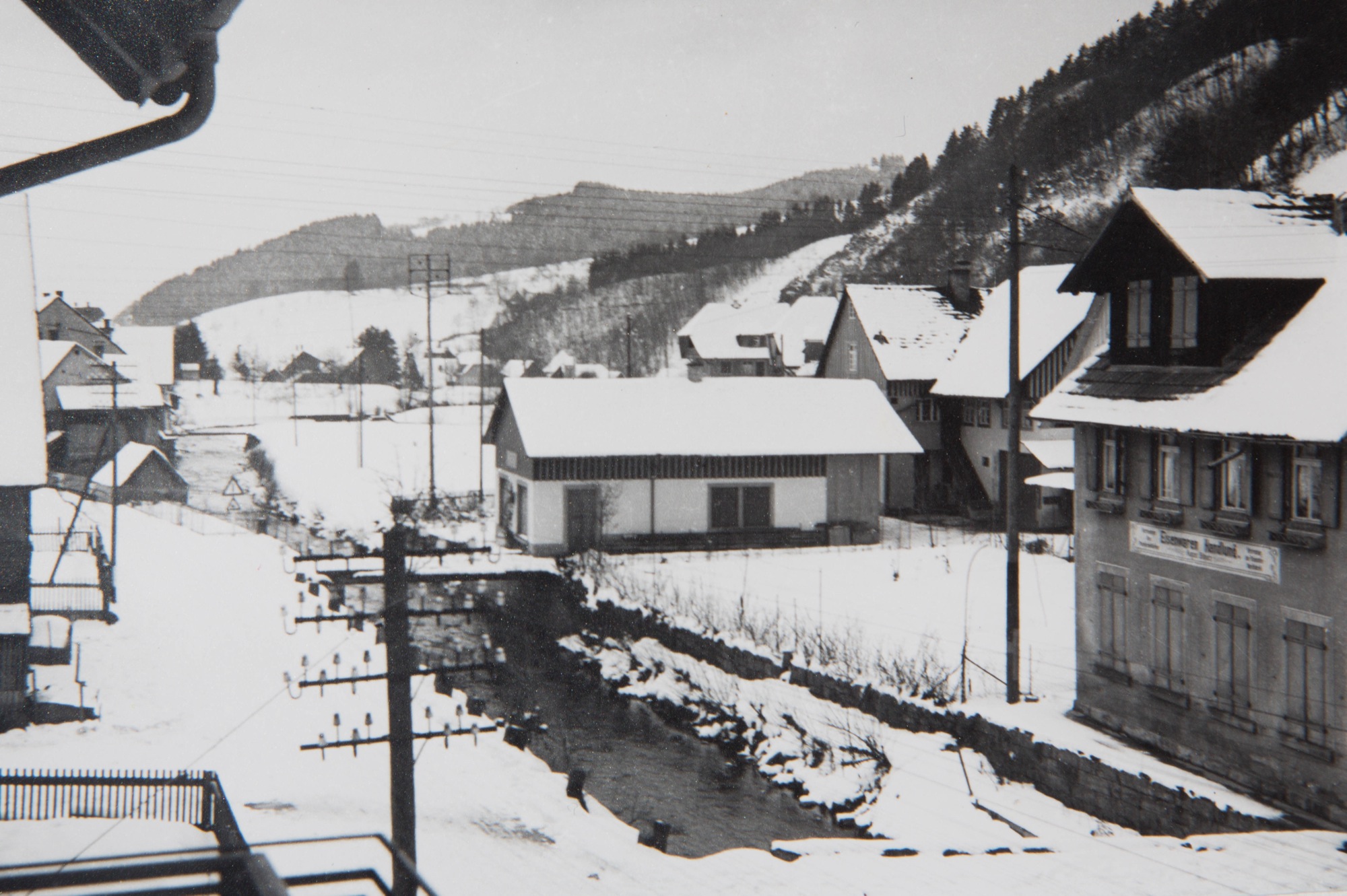 Lösung: Das Bild entstand Mitte der 1950er Jahre. Der Blick richtet sich von der Schlosserei Haag talabwärts zum Elektrofachgeschäft Schneider vor dem Umbau. Anton Schneider wurde 1918 von der Gemeinde nach dem Anschluss an das öffentliche Netz zum Lichtmeister bestellt. Im selben Jahr gründete er ein Elektrofachgeschäft – für Oberharmersbach hatte ein neues Zeitalter begonnen.