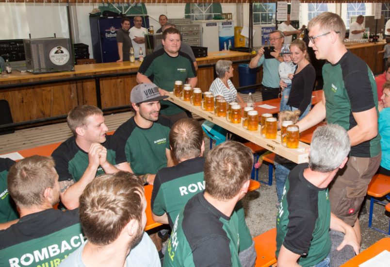 Da gilt es, die in erwartungsvoller Haltung zum Festzelt gepilgerten hungrigen Handwerker zu sättigen und die eine oder andere »trockene« Baustelle vergessen zu machen. Wer letztlich die Initiative für einen zügigen Ablauf ergriffen hat und mit einer »Rombach-Tafel« dem zeitgleichen Drang nach einem kühlen Bier Abhilfe geschaffen hat, war von untergeordneter Bedeutung. Zwei »ausgedeutete« Freiwillige zauberten fachgerecht auf einem akkurat abgerichteten Holz immerhin 18 Glas Bier gleichzeitig auf den Tisch. Einmal mehr zeigte die Firma Rombach, dass der im Juni dieses Jahres verliehene Innovationspreis in jeder Hinsicht an der richtigen Adresse gelandet ist.