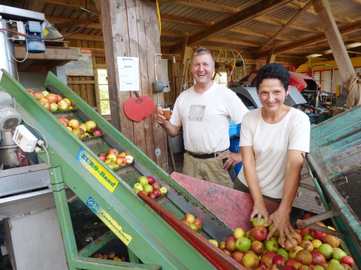 Die mehrere Meter lange Entsaftungsanlage steht unter einem riesigen, nach vorne hin offenen Unterstand. Ein Traktor hat die hoch gefüllte Ladefläche seines Anhängers schräg gestellt. Die fruchtige Fracht landet auf einem Transportband – sie wird gewaschen, zerkleinert und gepresst, mit einer Stundenleistung von bis zu 500 Litern. Einen Teil des eigenen Saftes nimmt der Obstbauer in einem riesigen, 1.000 Liter fassenden Kunststoffbehälter mit nach Hause – zur Vergärung, zum anschließenden Schnapsbrennen.