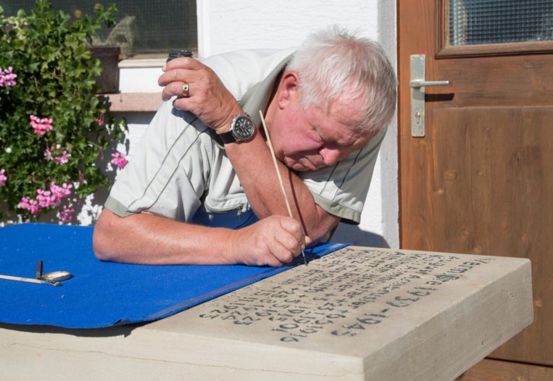Im örtlichen »Sozialverband VdK Deutschland e. V.« haben Friedebert Stehle und Ingrid Nock die Initiative ergriffen. Der Bauhof der Gemeinde reinigte die beiden Tafeln. Mit Willi Hug, der schon mehrfach im Gemeindewald den einen oder anderen Schriftzug nachgezogen hat, fanden sie einen Fachmann, der derzeit Buchstaben für Buchstaben, Zahl für Zahl zu einer besseren Lesbarkeit verhilft, rund 1.700 Zeichen.