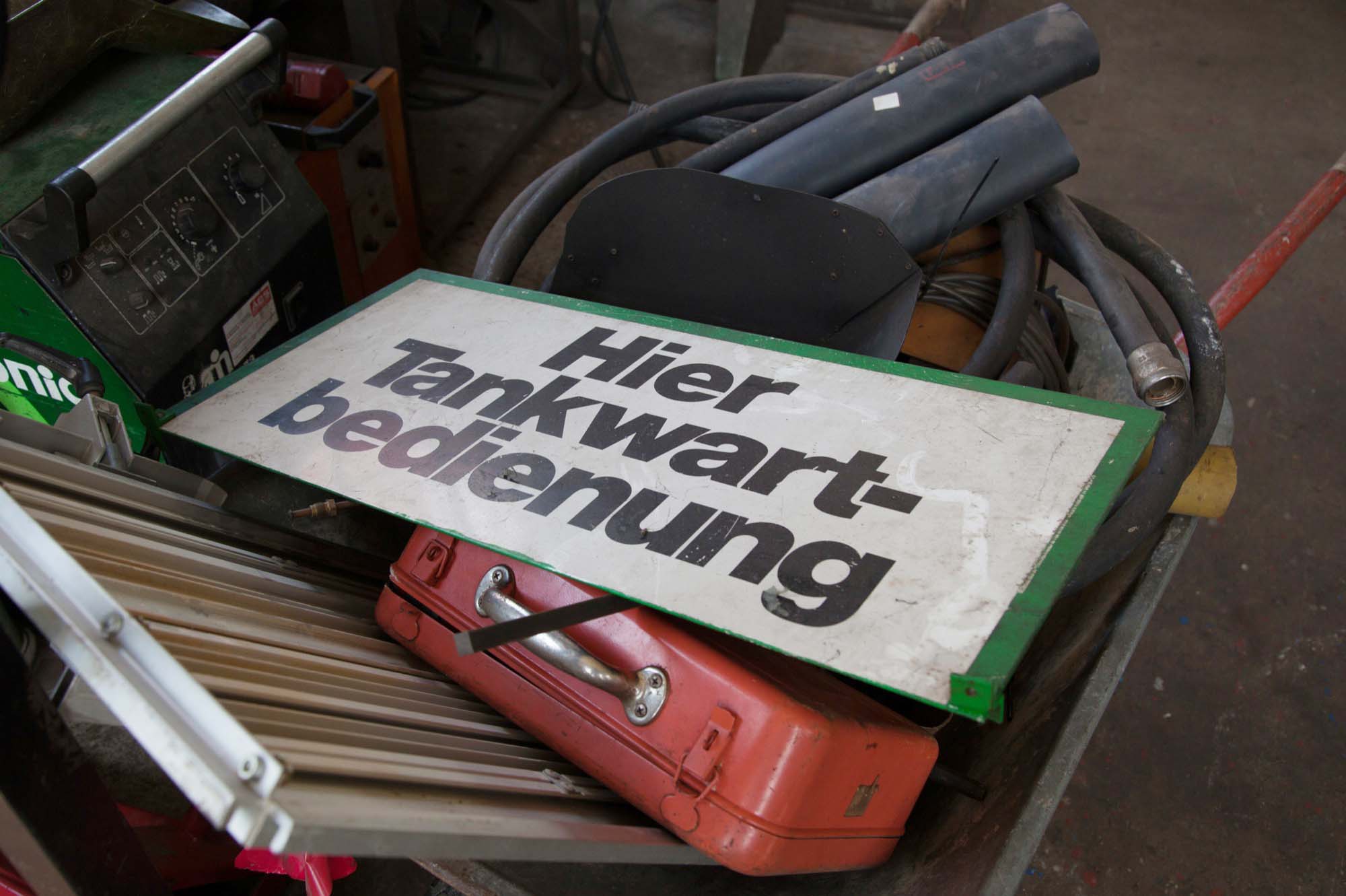 Seit Mitte der 1950er Jahre gehörten die Tankstellen zum Ortsbild. Bis in die 1970er Jahre zählte man deren drei: Werkstatt Baumann im Dorf (dea/texaco), Werkstatt Rombach im Dörfle (gasolin) und Werkstatt Brucher am Eingang des Riersbachtal (stinnes fanal). Sie ist die einzig verbliebene Zapfstelle und firmiert seit 1986 als freie Tankstelle. Das besagte Schild fand sich übrigens dort; wohl, wie die Umgebung des Bildes zeigt, um es endgültig zu »entsorgen«. Diese Zeiten kommen sicher nicht wieder, aber demnächst wird sicher eine »App« fürs Tanken angeboten, um dem Autofahrer nach den Bemühungen für autonomes Fahren einen weiteren Denkanteil abzunehmen…