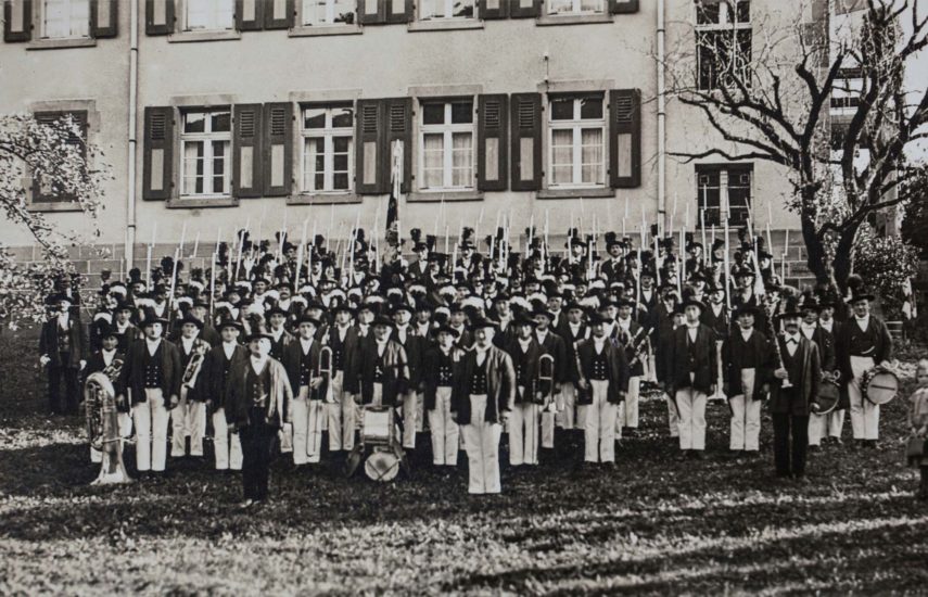 Lösung: Vor dem Pfarrhaus haben sich am Patrozinium 1934 Musikkapelle, Spielmannszug und Bürgerwehr aufgestellt. In jenem Jahr traten zum ersten Mal die an kirchlichen Festtagen gemeinsam auftretenden Vereine in der einheitlichen historischen Uniform auf. Die im 19. Jahrhundert neu als Verein formierte Bürgerwehr – Nachfolgerin der früheren »Bürger-Wehr« als Selbsthilfeorganisation zu Reichstalzeiten – trug seit jeher die frühere Männertracht des Tales, die Gewehrträger allerdings mit einer weißen Hose (zur Unterscheidung vom Kommando in schwarzer Hose). Der Spielmannszug, der sich in den 1920er Jahren allmählich formierte und die bisher den Zug begleitenden Trommler und Pfeifer ergänzte, kleidete sich in derselben Manier.