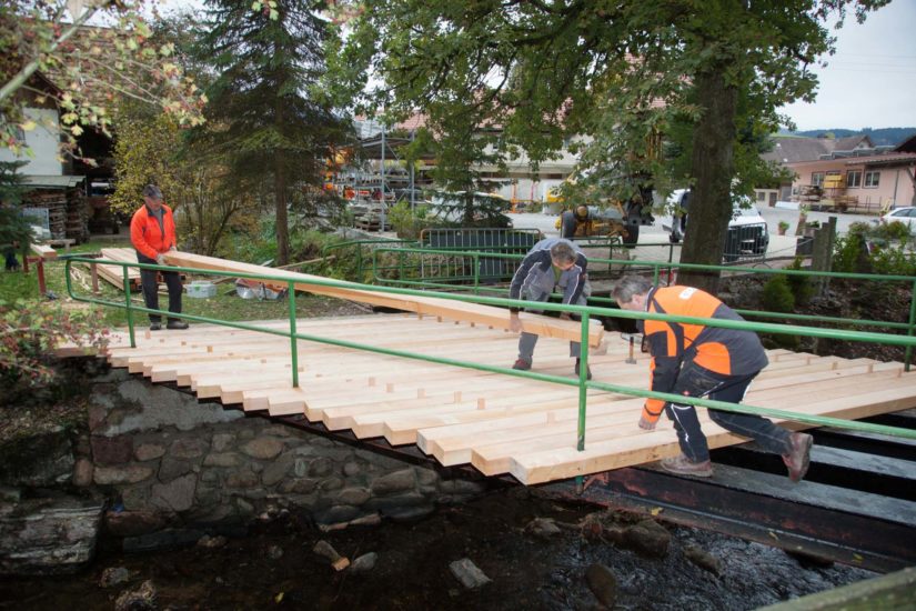 Jetzt wurde wieder eine Arbeit abgeschlossen. Mitarbeiter des Bauhofs haben gemeinsam mit dem Grundstücksanlieger Rudolf Gieringer die Arbeiten in Eigenregie ausgeführt. Die Brücke über den Harmersbach, die das Unterdorf mit einem beliebten Wanderweg (Franziskusweg und einem Zugang zum Hademarpfad) verbindet, hat jetzt einen neuen Belag. Zwölf Zentimeter starke Bohlen aus Douglasienholz lagern auf den wuchtigen Doppel-T-Trägern. Rund 30 Stunden Arbeit leisteten die Arbeitskräfte, etwa 3.500 Euro kostete die Sanierung, wovon etwa 2.300 Euro auf Materialkosten entfielen.