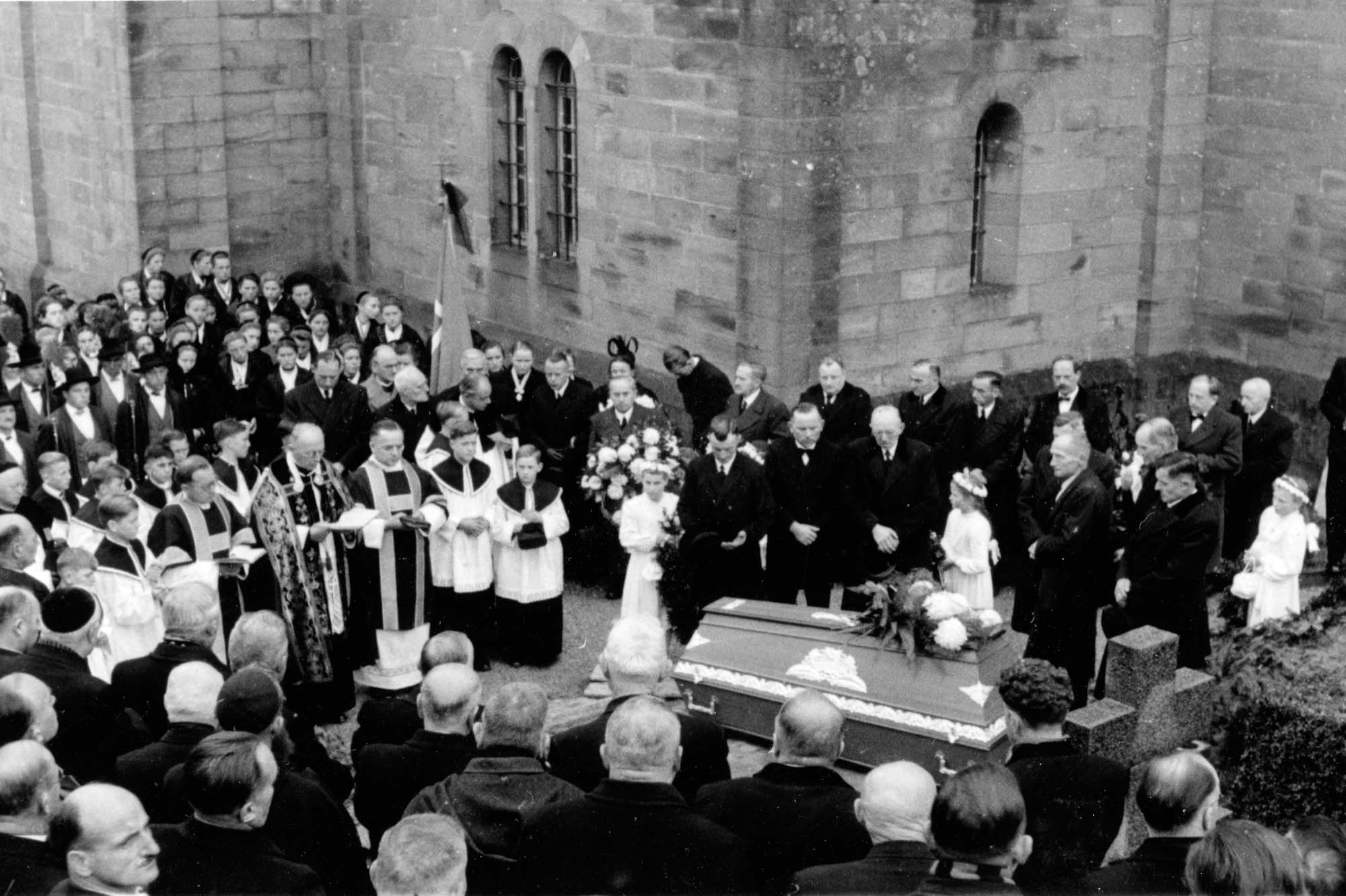 Auf dem Bild sind zu erkennen: Vor der (alten) Sakristei haben die Gemeinderäte Aufstellung genommen, hinter dem weiß gekleideten Mädchen am linken Sargende steht mit einem Kranz Bürgermeister Ludwig Braun, rechts daneben Mitglieder des Gemeinderats. Hinter der Geistlichkeit ist die Bürgerwehr zu sehen.