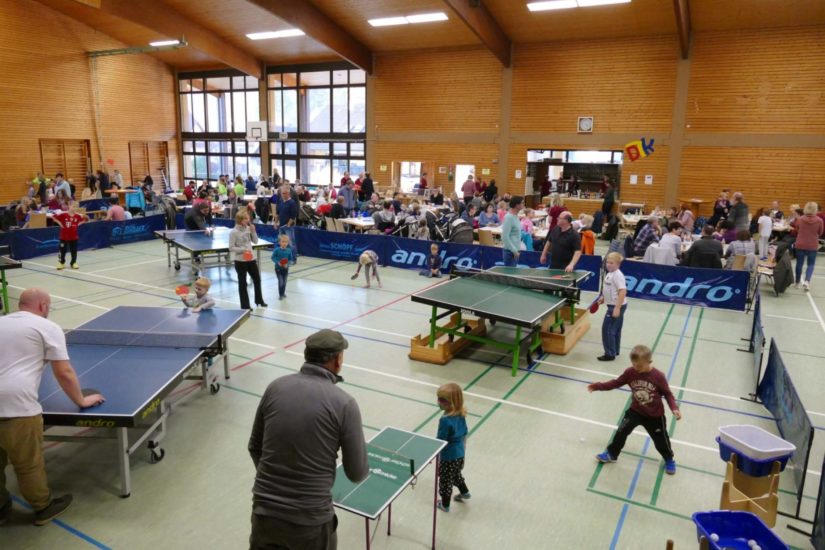 So spielten viele Erwachsene die verschiedenen Tischtennisvariationen durch und dabei fanden auch ganz kleine Tischtennisschläger ihren Einsatz.