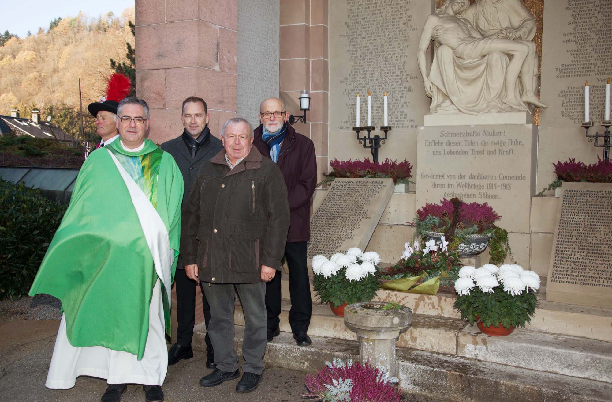 Gedenken: Pfarrer Bonaventura Gerner, Bürgermeister Richard Weith, Willi Hug und Friedebert Stehle (von links) gestalteten die Feierstunde anlässlich der Segnung der restaurierten Tafeln des Kriegerdenkmals. Foto: Lehmann-Archiv