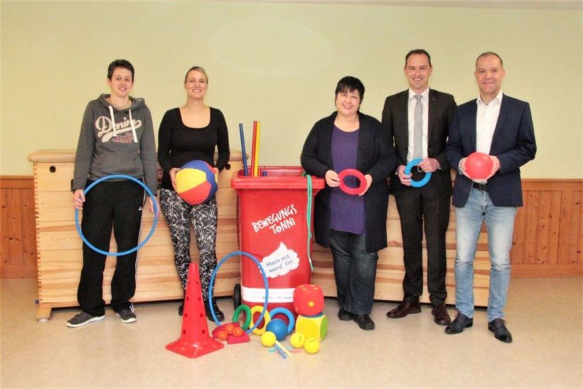 Das Kinderhaus Sonnenblume bekam dazu im Vorfeld eine Bewegungs-Tonni, die mit bunten, kindgerechten Materialien (Seile, Stäbe, Schwungtuch und Bälle uvm.) gefüllt ist und die Kleinen zu Bewegung und Spiel auffordert. Auch bekommt der begleitende Verein einen finanziellen Obolus. Somit ermöglicht die Stiftung den Kindern einen Zugang zu einer regelmäßigen, hochwertigen motorischen Grundlagenausbildung durch eben einen Trainer und einer Erzieherin. Die Turnstunde findet in der Reichstalhalle statt, unter der Leitung von Nicole Lehmann von der DJK und Nadine Müller einer Erzieherin vom Kinderhaus Sonnenblume.