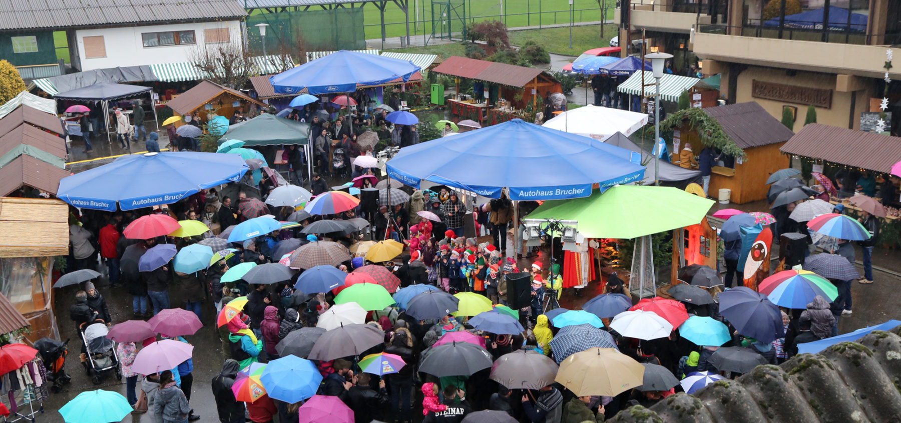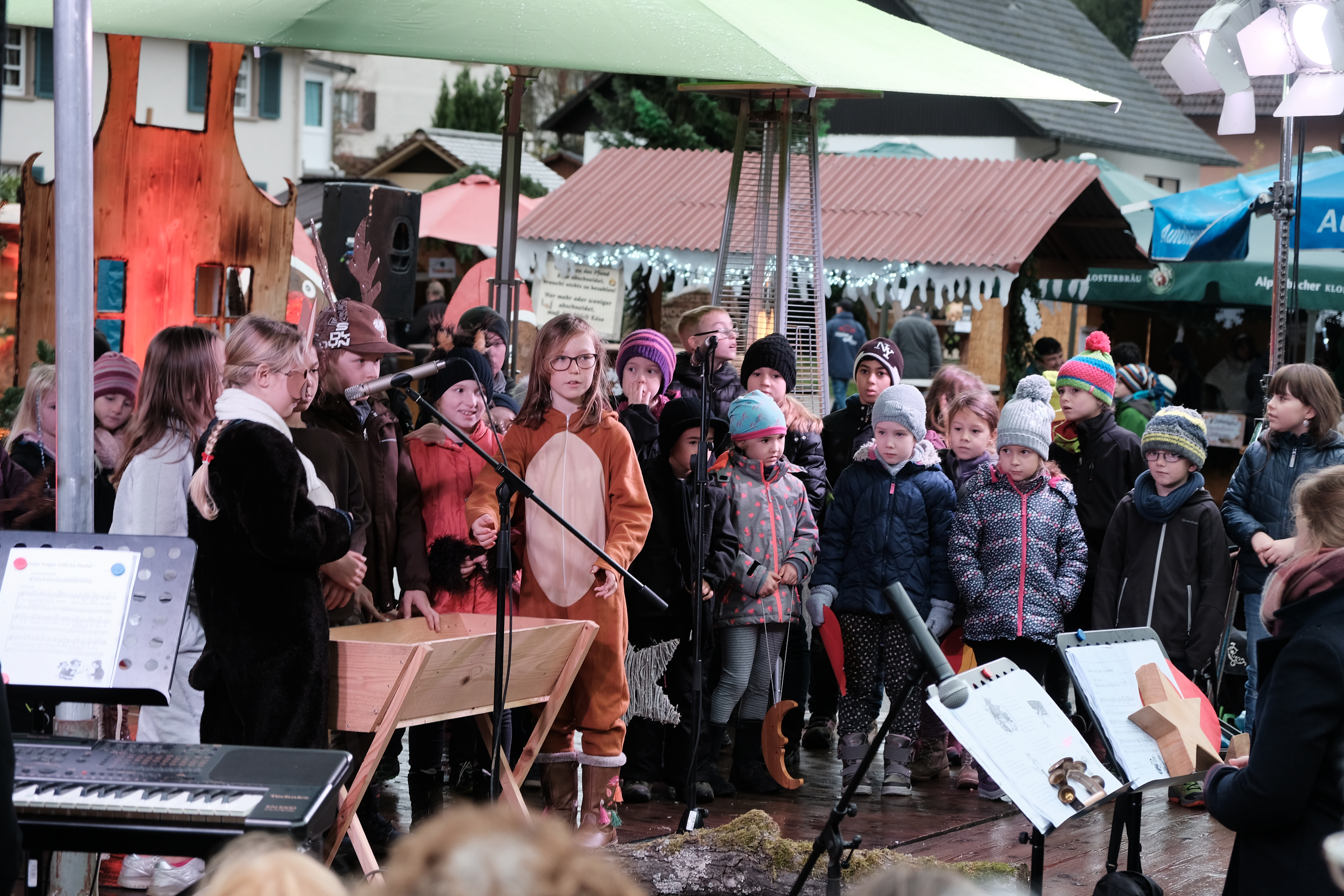 Das Organisationsteam hatte sich wieder jede Menge Mühe gegeben, um ein attraktives Programm auf die Beine zu stellen. Felix Huber moderierte den Tag, der Chor der Brandenkopfschule spielte und sang zur Eröffnung ein Stück vom Winter und von Weihnachten, vom Förster und den Tieren im Wald. Mit dem inbrünstig geschmetterten »Gloria« aus den Kinderkehlen kam so trotz milder Temperaturen, unberechenbarer Regenschauer und Sturmböen doch Adventsstimmung auf dem Platz vor der Reichstalhalle auf.
