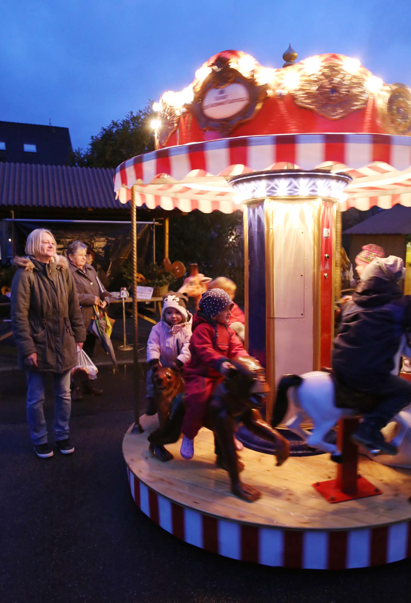 Auf der zentralen Bühne eröffnete Bürgermeister Richard Weith den Weihnachtsmarkt zusammen mit dem Chor der Brandenkopfschule. Ein Ensemble der Miliz- und Trachtenkapelle Oberharmersbach stimmte später weihnachtliche Weisen an, der Nikolaus kam mit Knecht Ruprecht, die Kindergarten-Kinder standen auf der Bühne, Tobias Gnacke reiste am Nachmittag mit dem Kinder-Musik-Comedy-Theater musikalisch um die Welt und als es dunkel wurde, waren Luisa und Maxi da. Man sah: Weihnachten ist vor allem ein Fest für die Kinder – entsprechend gab es weitere Attraktionen, wie das Ponyreiten, Stockbrot-Grillen, Kinderschminken und Erzähltheater. Im Bereich der Märchen-Schatten waren indes um