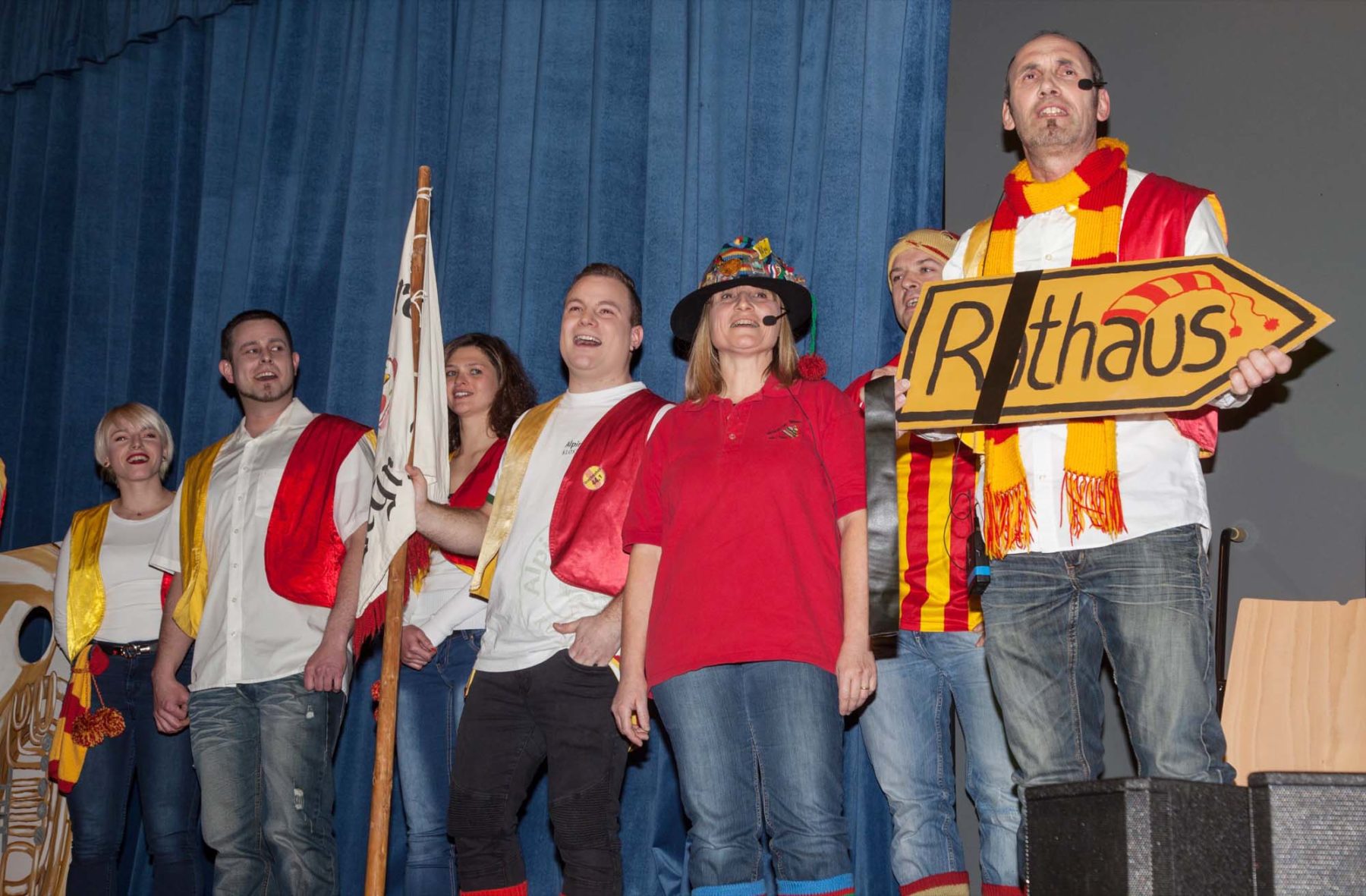 In der Bütt machte sich Uli darüber lustig, dass der Bürgermeister jetzt »weit(h) weg vom Dorf« sei. Für den Zustand im Ort sei das undichte Dach des Feuerwehrhauses geradezu typisch. Dies liege auch daran, dass man beim Ausverkauf des Rathausinventars den »Bürgermeistersessel billiger als einen Aufbrühkessel« verscherbelt hätte, weswegen man auch keine Reichtümer anhäufe könne.