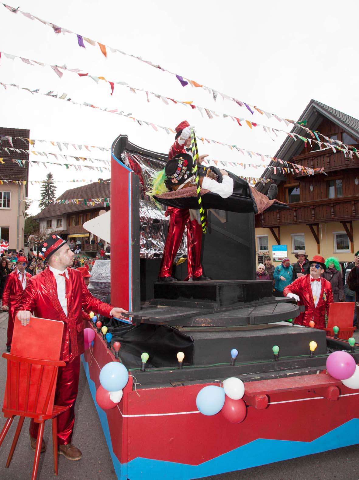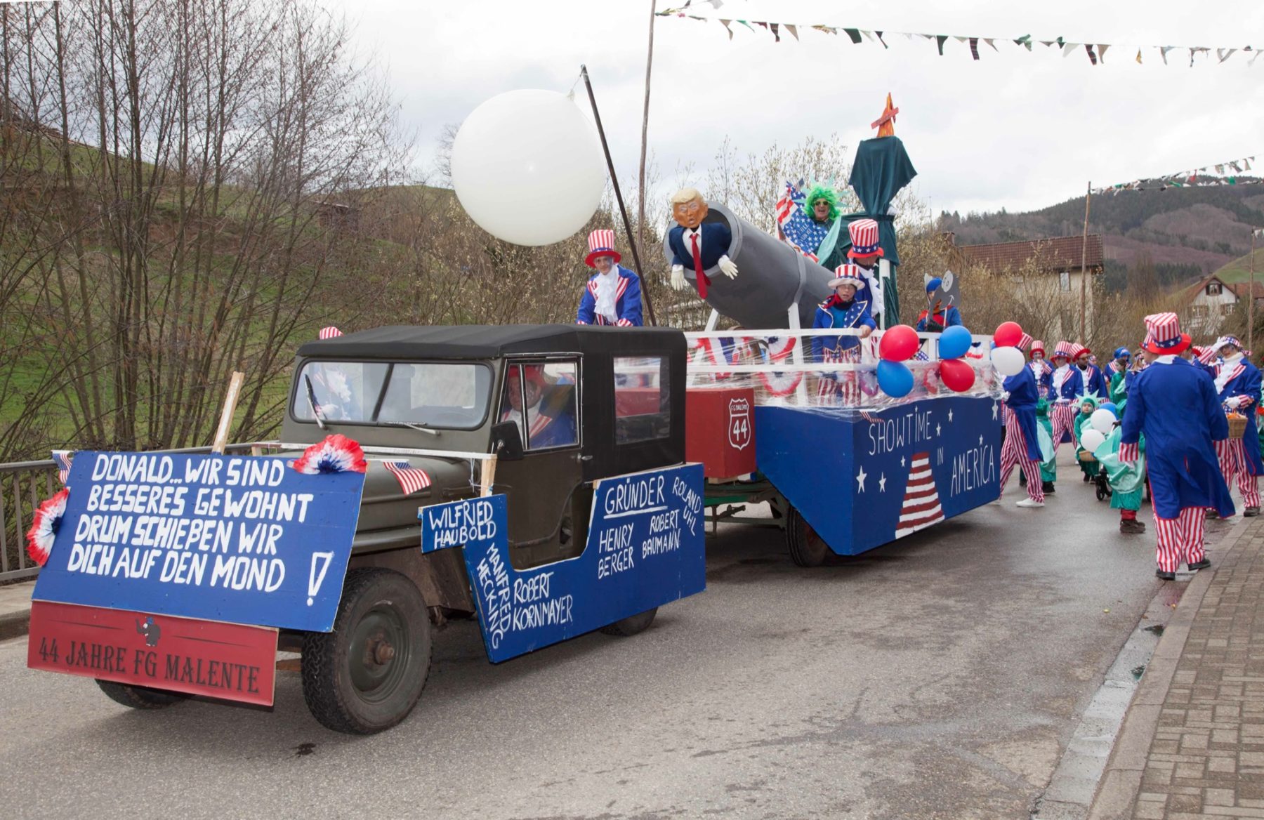 Gleich mehrmals »jubelte« es im Umzug. Die Unterdorfer Narren hatten zu ihrem 55. Geburtstag eine Show aus Las Vegas mit Zauberei und Magie aufgelegt, garniert mit passenden Kostümen und Tanzeinlagen. Der Fanclub, seit 40 Jahren dabei, hatte allen Grund zum Feiern, weil aus seinen Reihen auch der Mottovorschlag kam. Die »Schlauchis« verlegten ihren 33. Geburtstag in den Zirkus und ließen mit einer fahrbaren Geburtstagstorte die zahlreichen Schaulustigen entlang der Talstraße an ihrem Fest teilhaben. Die Gruppe »Malente«, die auf 44 Jahre Fasent zurückblicken kann, wurde richtig politisch. »Donald, wir sind besseres gewohnt, drum schießen wir Dich auf den Mond« lautete kurz und knapp die Botschaft an ihrem Motivwagen.