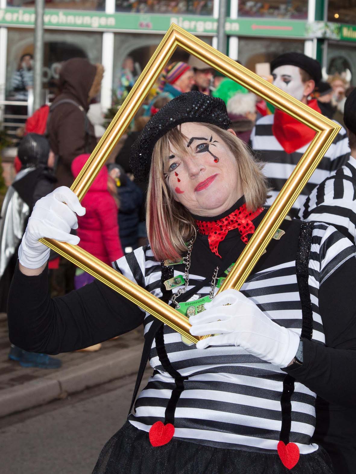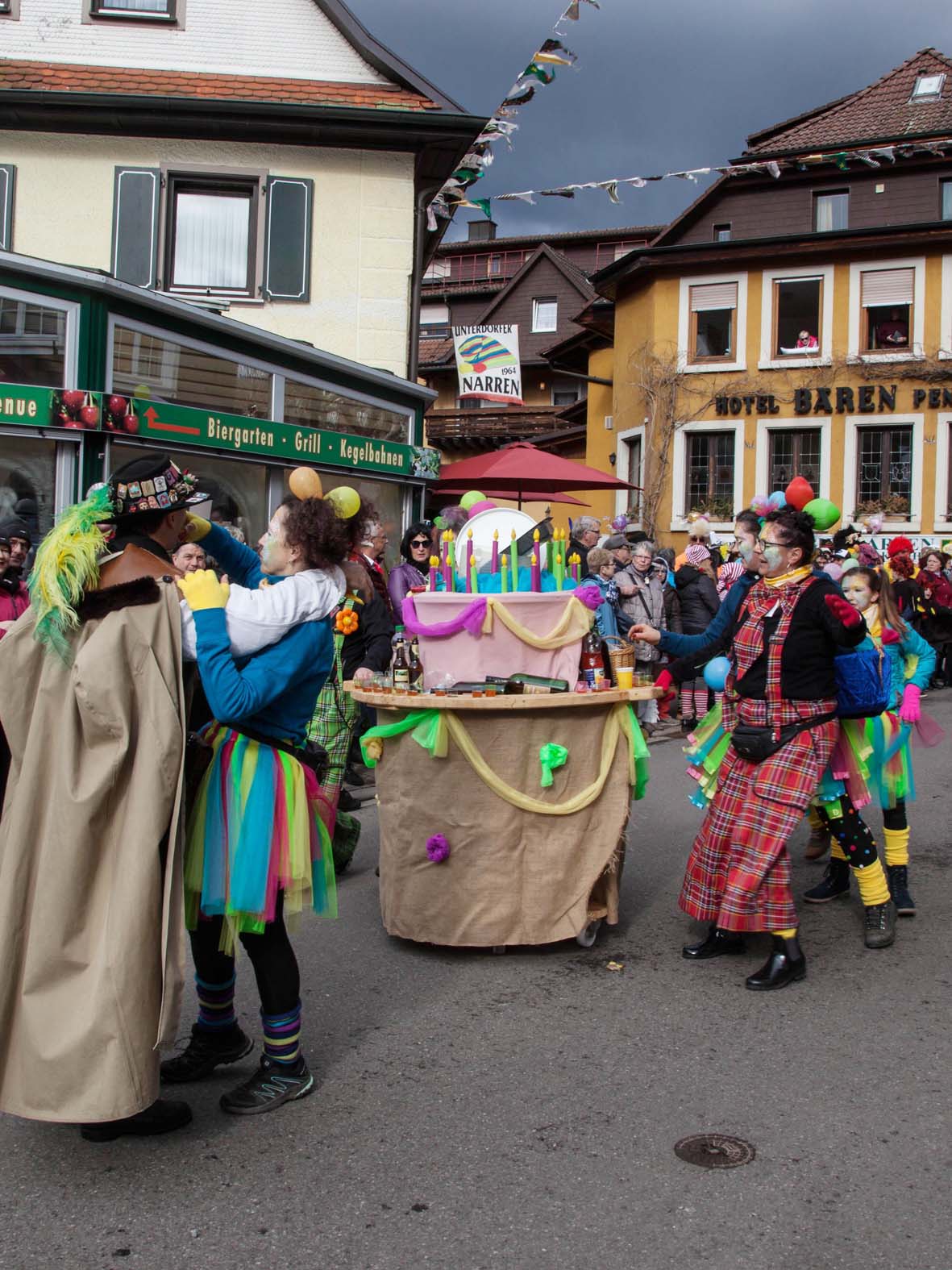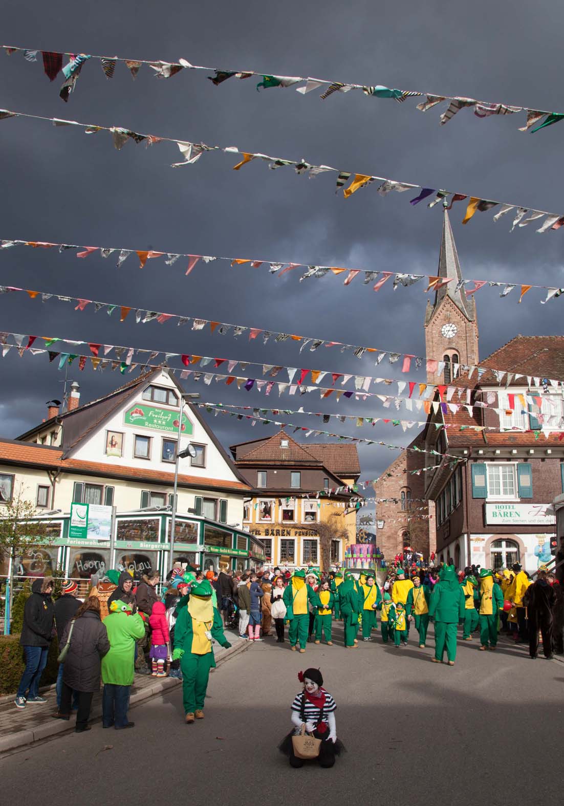 In diesen Tagen gehört der Wetterbericht zum Fasentumzug dazu. Zog gegen 13 Uhr noch ein kräftiger Schauer über das Tal, so riss der böige Wind pünktlich zum Umzugsbeginn am Fasentmontag die Wolkendecke auf und ließ die farbenprächtigen Kostüme in der spätwinterlichen Sonne glänzen.