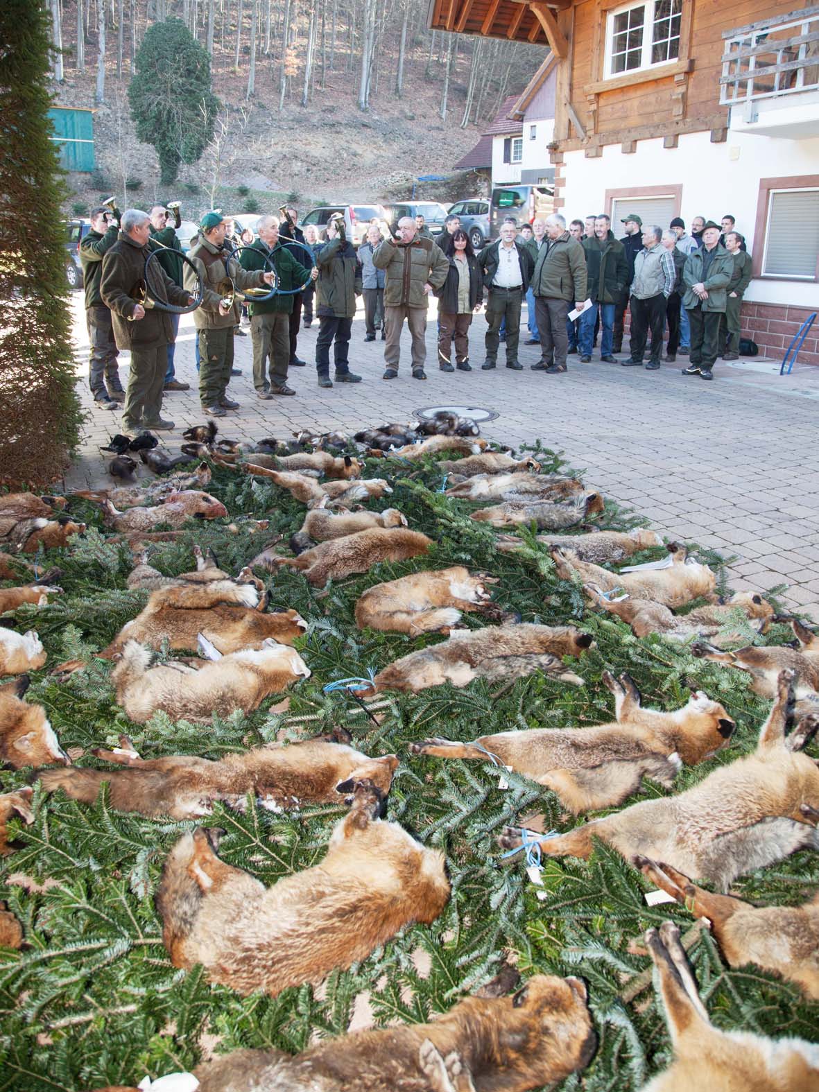 Das Ergebnis der Ausbeute während der Fuchs- und Raubzeug­wochen war beachtlich. 56 Füchse, 10 Steinmarder, zwei Baummarder, ein Iltis und zwei Rabenkrähen zählte die Strecke, die der Hegering 5 (Zell/Harmersbachtal) zur Begutachtung der Felle ausgebreitet hatte.