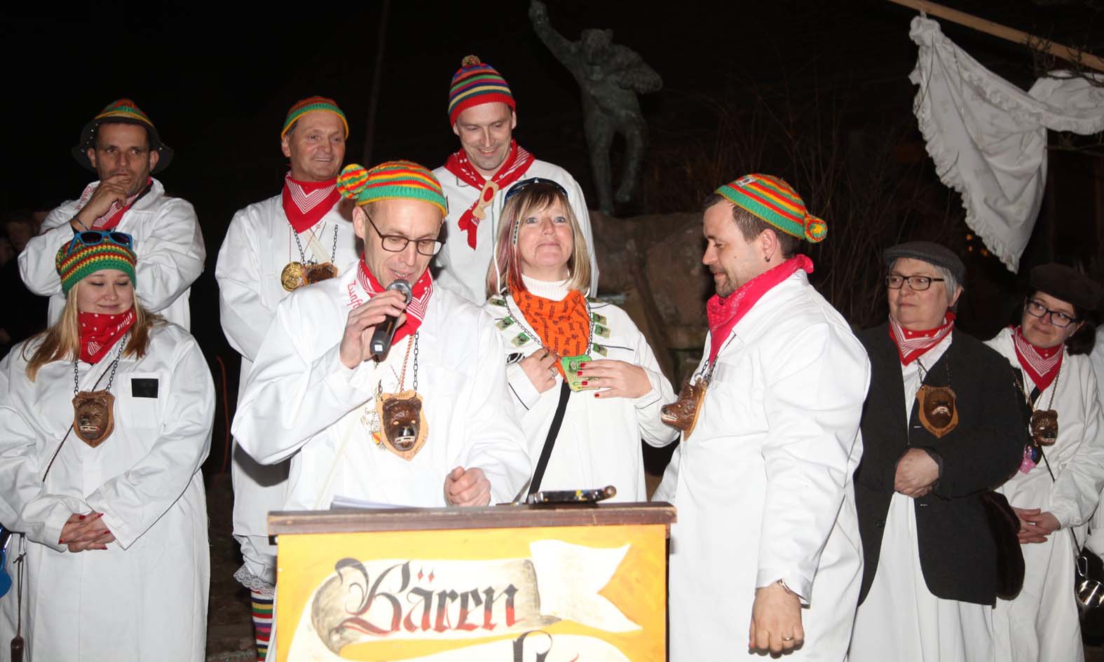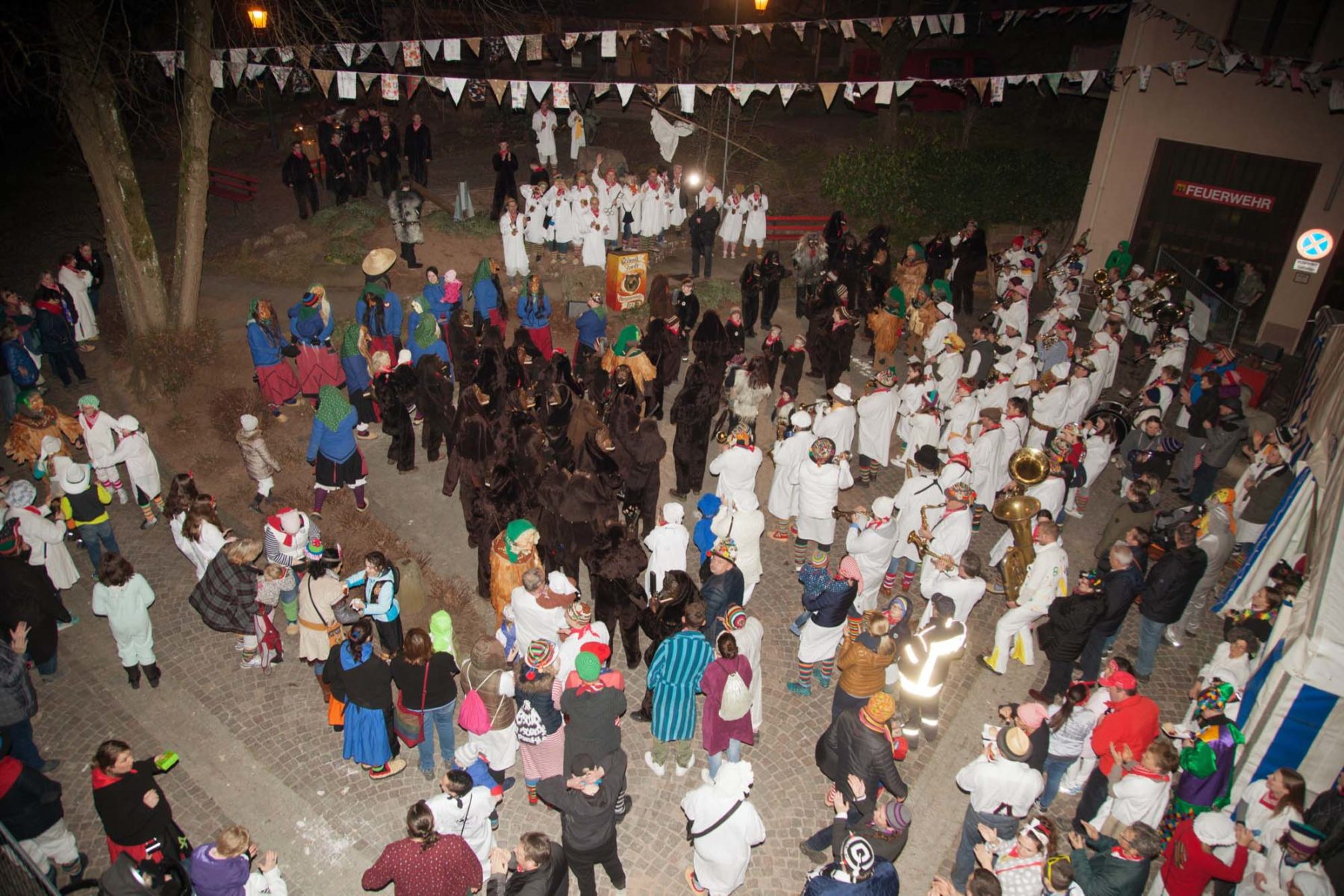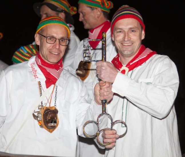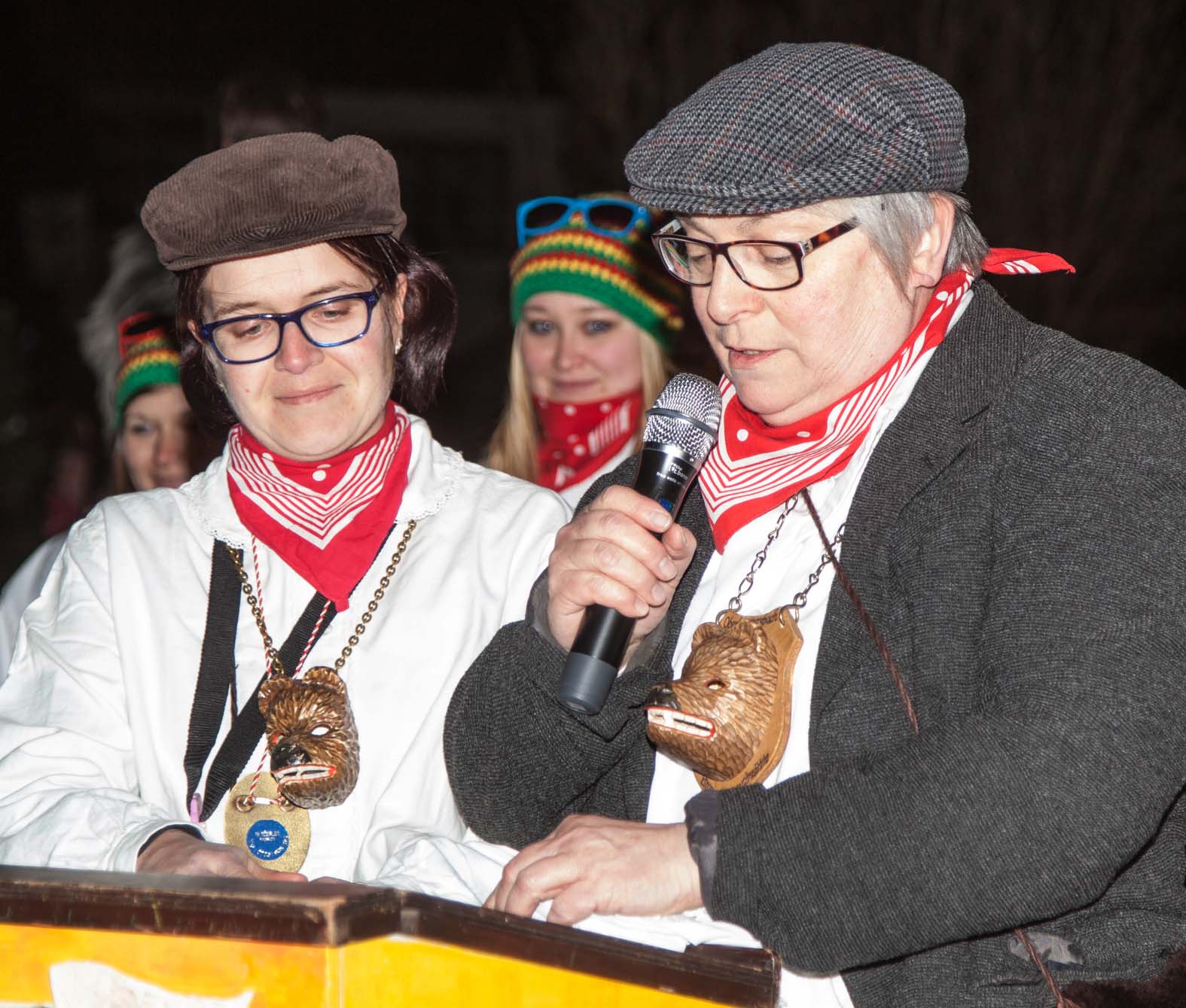 Foto: Lehmann-ArchivRichard Weith, am »Schmutzige« eher Mühlengeist denn Bürgermeister, hatte sich im Museum versteckt, weil das Rathaus nicht gerade zum Verweilen einlädt. Dort spürte ihn der Zunftrat auf und trug ihn zum Narrenbrunnen, um die Herausgabe des Schlüssels zu fordern. »Des Schloss von dem Rothus isch nicht mehr des alte, des isch jetzt ä Schloss für ä Baustell ä kalte« freute sich Bürgermeister Richard Weith diebisch. Er habe die Narren eigentlich für schlauer gehalten, denn er könne jetzt von außen zuschauen und sie sollen bloß nicht jammern, wenn sie in dem halbfertigen Gemäuer frieren müssten, Auf dem Dorfplatz hatten sich die Hemdklunker eingefunden, um mit der Miliz- und Trachtenkapelle die heiße Phase der Fasent zu eröffnen. Die »Lückenfüller« (Iris Brosamer und Martina Nessler) unterhielten das närrische Volk. Petra Roth vom Fanclub hatte das Motto des Umzugs »It’s Showtime – Oberharmersbach lädt ein« vorgeschlagen und erhielt dafür die Mottokrone. Der Auftakt der Fasent wurde im Zelt auf dem Dorfplatz tüchtig gefeiert.