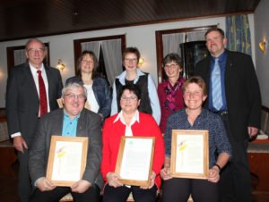 Seit 15 Jahren singen Hildegard Pfundstein und Regina Börsig im Chor. Für 25 Jahre überreichte Präses Alfred Haas Martina Lehmann die entsprechende Urkunde und die Silberne Ehrennadel des Cäcilienverbandes. Sie habe sich, so Haas, mit ihrer Tätigkeit in der Vorstandschaft seit 2005 und der Aufgabe als Schriftführerin im Jahre 2013 zusätzliche Verdienste erworben. Christa Haas trat vor 40 Jahren in den Kirchenchor ein und übt seit 30 Jahren zuverlässig das Amt der Notenwartin aus. Sie erhielt ebenso wie Chorleiter Andreas Müller, der seine Neigung für die Kirchenmusik in Schenkenzell vor 40 Jahren entdeckt und seit 2014 den Kirchenchor Oberharmersbach leitet, die Goldene Ehrennadel des Cäcilienverbandes.