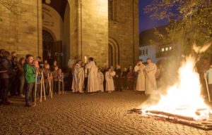 Traditionell brannte vor der Pfarrkirche St. Gallus das Osterfeuer, an der Pfarrer Bonaventura Gerner die Osterkerze entzündete, um anschließend mit den Gläubigen in die Kirche einzuziehen.