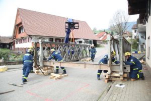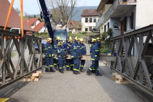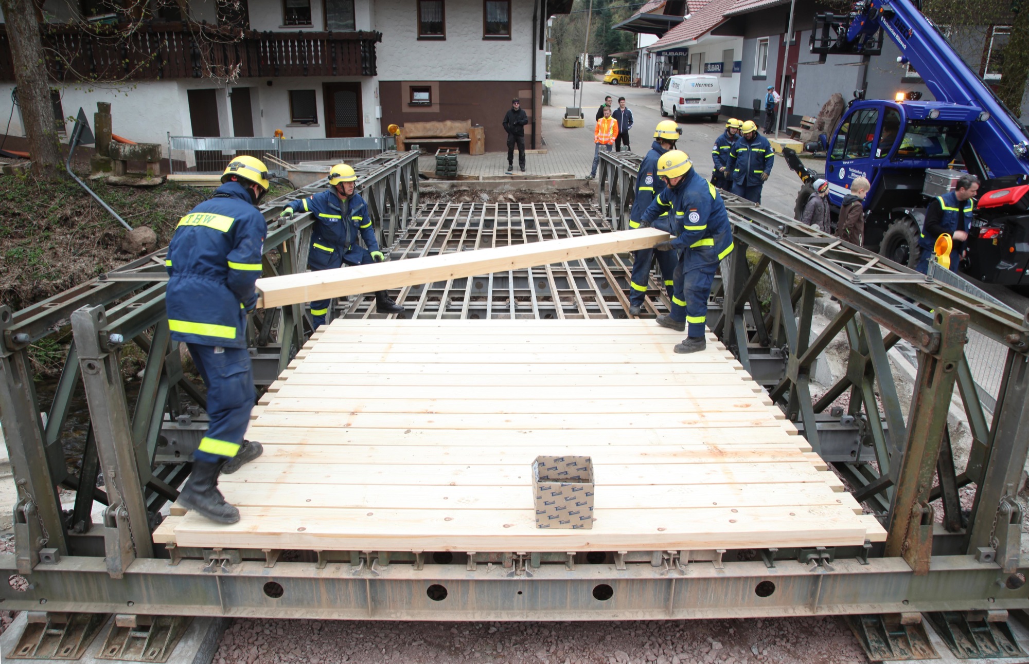 »Das Team hat ganze Arbeit geleistet« lobte Zugführer Marc Wiencke, der sich auch über die Einhaltung des Zeitplanes zufrieden zeigte. Der Zugführer aus Müllheim leitete zusammen mit seinem Stellvertreter Alexander Rombach den Arbeitseinsatz. 15 THW-Helfer aus Müllheim, Biberach und Offenburg umfasste das Arbeitskommando, das eine so genannte »Bailey-Brücke« zu montieren und zu verlegen hatte. Diese Brücke, deren seitlich aufragende »Felder« durch »Querträger« verbunden sind, ist eine kleinere Variante der Brücken, die auch das THW für die Dauer der Sanierung der Ortsdurchfahrt in Zell-Unterharmersbach errichtet hat.