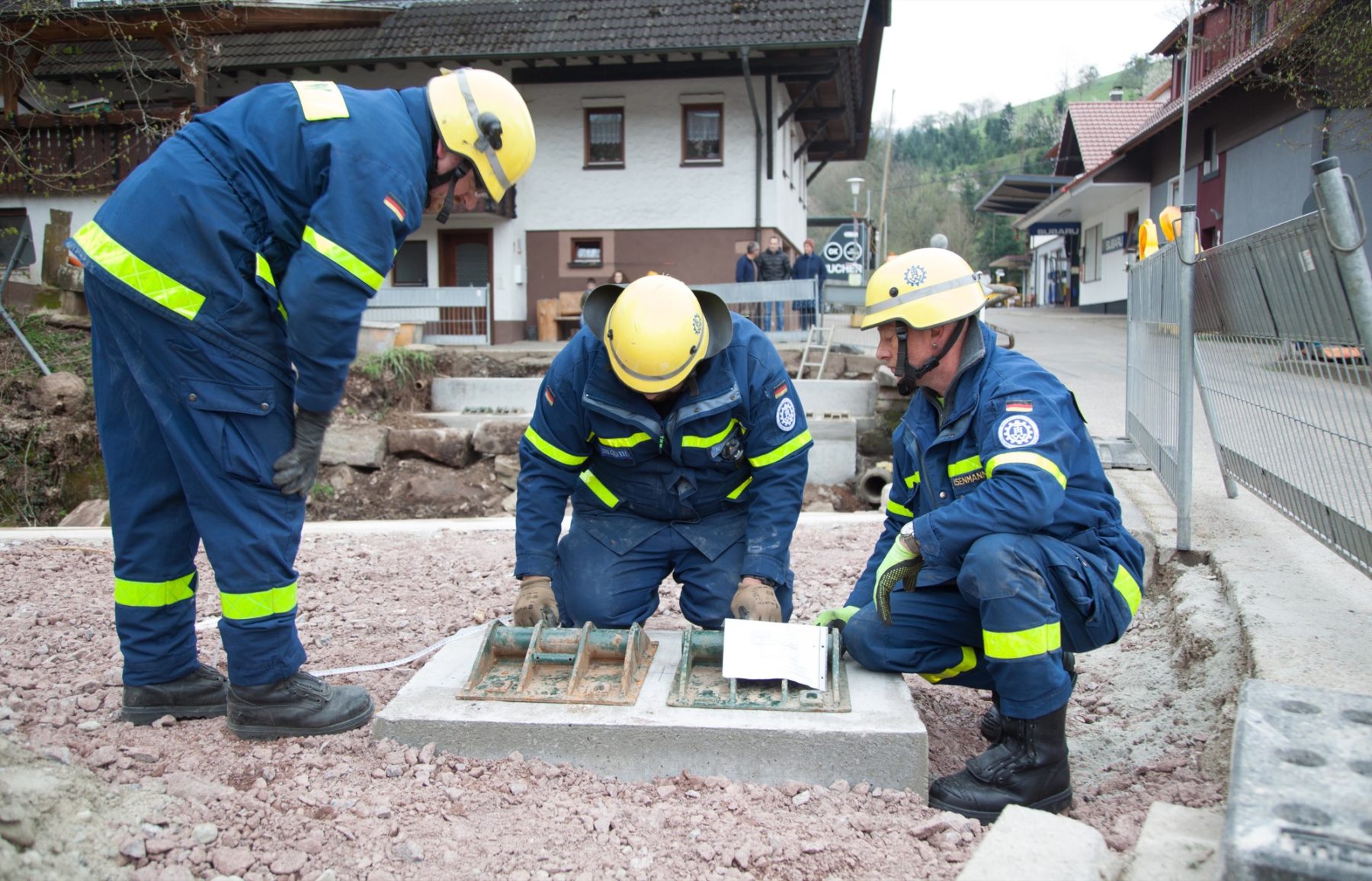 Gegen acht Uhr am Samstagmorgen trafen die ersten blauen Fahrzeuge des Technischen Hilfswerks (THW) ein, gegen 13 Uhr wurde das teilmontierte Metallgerüst über den Harmersbach eingehoben und noch vor 17 Uhr waren die letzten Arbeiten für die Behelfsbrücke zum Riersbachtal abgeschlossen.