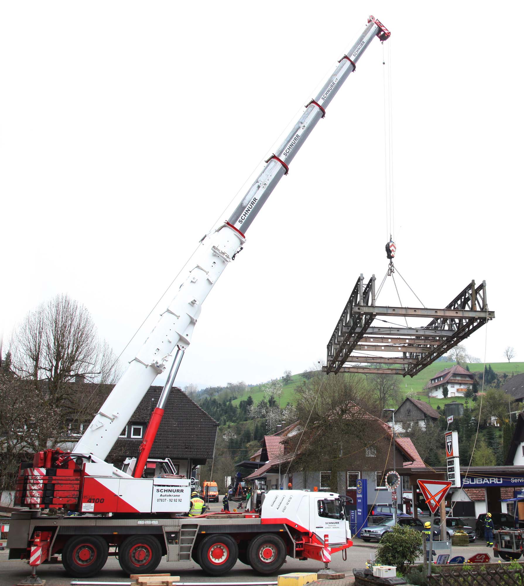 Knapp vier Stunden sind vergangen, als der Kran aufgebaut wird. Derweil werden auf den vorgefertigten Fundamenten beiderseits des Talbaches die Lager millimetergenau ausgerichtet. Kranführer Dirk Balin senkt die Anschlagketten für den Transport der rund acht Tonnen schweren Konstruktion. Langsam hebt sie sich vom Montagelager und schwebt ein paar Zehnermeter auf die andere Seite zu ihrem künftigen Bestimmungsort. Noch einmal ist höchste Präzision gefordert, um die Behelfsbrücke auf den Lagern zu platzieren. Wenige Zentimeter noch muss der Haken abgesenkt werden, dann sitzt die Behelfsbrücke exakt an ihrem Platz.