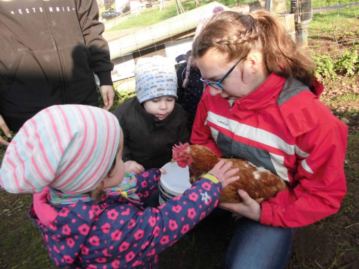Mit Begeisterung folgten die Kinder der Einladung ihrer Praktikantin Marita, den Bauernhof ihrer Eltern auf dem Billersberg zu besuchen. Unterteilt in zwei Kleingruppen war der steile Weg zum Billersberg mit dem neuen Elektro-Bus auch für die 1 bis 3 -jährigen Kinder sehr gut zu bewältigen. An dieser Stelle nochmals ein großes Dankeschön an den Kleintierzuchtverein, der uns mit seiner Spende beim Kauf des E-Busses so großzügig unterstützt hat. Die Bauernhofpädagogin Gertrud Kornmayer und Marita empfingen uns sehr herzlich mit einem liebevoll hergerichteten Sitzkreis. Sehr anschaulich erfuhren die Kinder nun alles Wissenswerte über den Lebensraum der Bauernhoftiere und deren Nahrung. Anschließend erhielt jedes Kind einen kleinen Eimer gefüllt mit Getreide, Mais, Salat, Gras, zerstampften Schneckenhäuschen und Wasser. So ausgerüstet ging es nun in den Hühnerstall, wo jedes Kind die Gelegenheit hatte, die Hühner selbst zu füttern und sie in aller Ruhe zu beobachten. Dabei wurde auch so manches Ei entdeckt, die eine oder andere Feder bewundert und als Andenken mitgenommen. Die Kinder waren mit größtem Interesse bei der Sache. Der Ausflug zum Bauernhof war ein rundum spannendes und fröhliches Erlebnis. Jedes Kind durfte ein ausgeblasenes Ei zum Bemalen mit in das Kinderhaus nehmen. Eine Riesenüberraschung erwartete die Kinder ein paar Tage später, als Marita drei frischgeschlüpfte Küken zum Bestaunen mitbrachte. »Wir möchten uns herzlich bei Familie Kornmayer für ihre Mühe und Zeit bedanken«, so das Kinderhaus Sonnenblume. »Dieser Besuch im Hühnerstall bleibt für uns alle ein einmaliges und unvergessliches Erlebnis.«