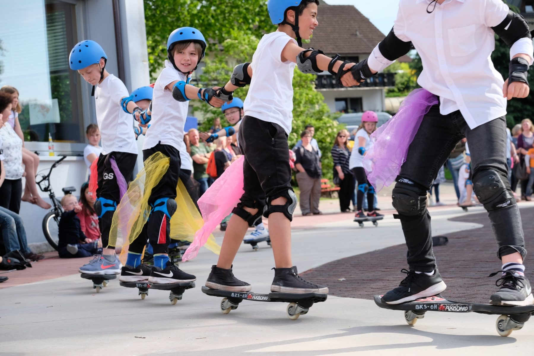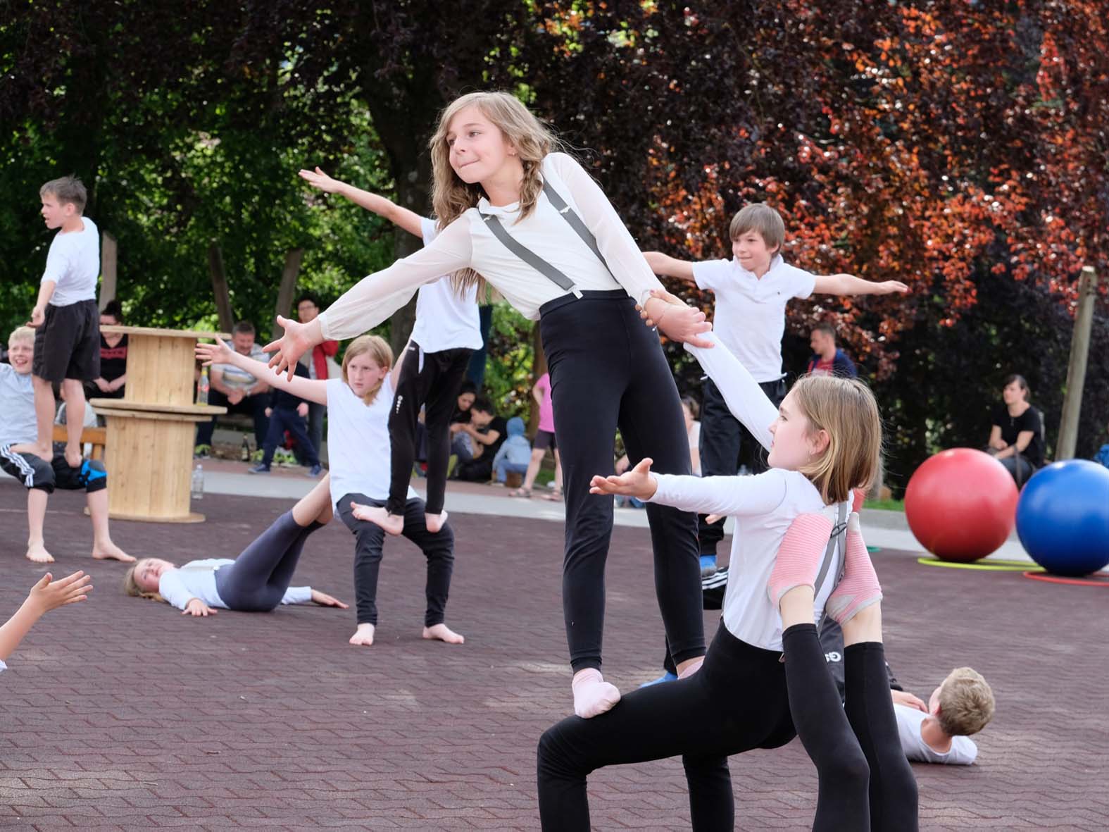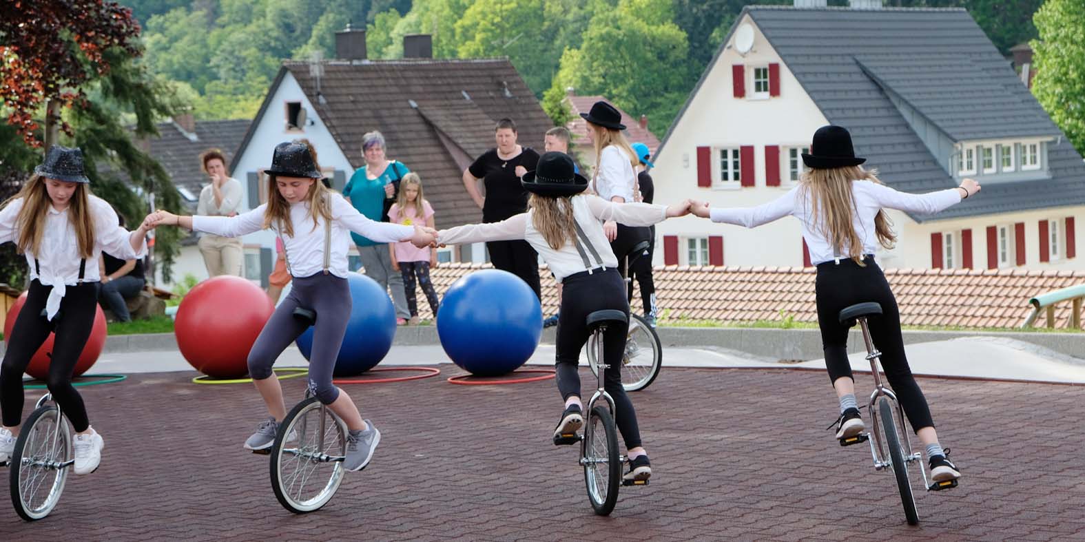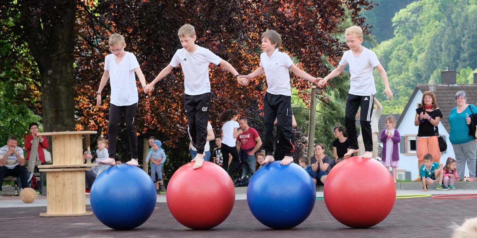Richtig Action war auf dem Hof, als die Zirkus-AG ihren Auftritt hatte. Es wurde auf Bällen gelaufen, Einrad gefahren. Rasante Runden auf den Boards zu fetzigen Techno-Beats fehlten ebenso wenig wie akrobatische Einlagen. »Das Einrad ist das Gerät, das am trainingsintensivsten ist«, informierte Lehrer Paul Hug. Er zeigte sich umso froher, dass es möglich war, wieder eine präsentierfähige Einrad-Truppe am Start zu haben. Nicht zuletzt ist das Nele Schwarz und Mara Lehmann zu verdanken. Die beiden Gymnasiastinen – ehemaligen Brandenkopfschülerinnen – kommen als Lehrbeauftragte regelmäßig in die Schule, um solch zirkusreife Nummern mit den Schülerinnen und Schülern einzustudieren.