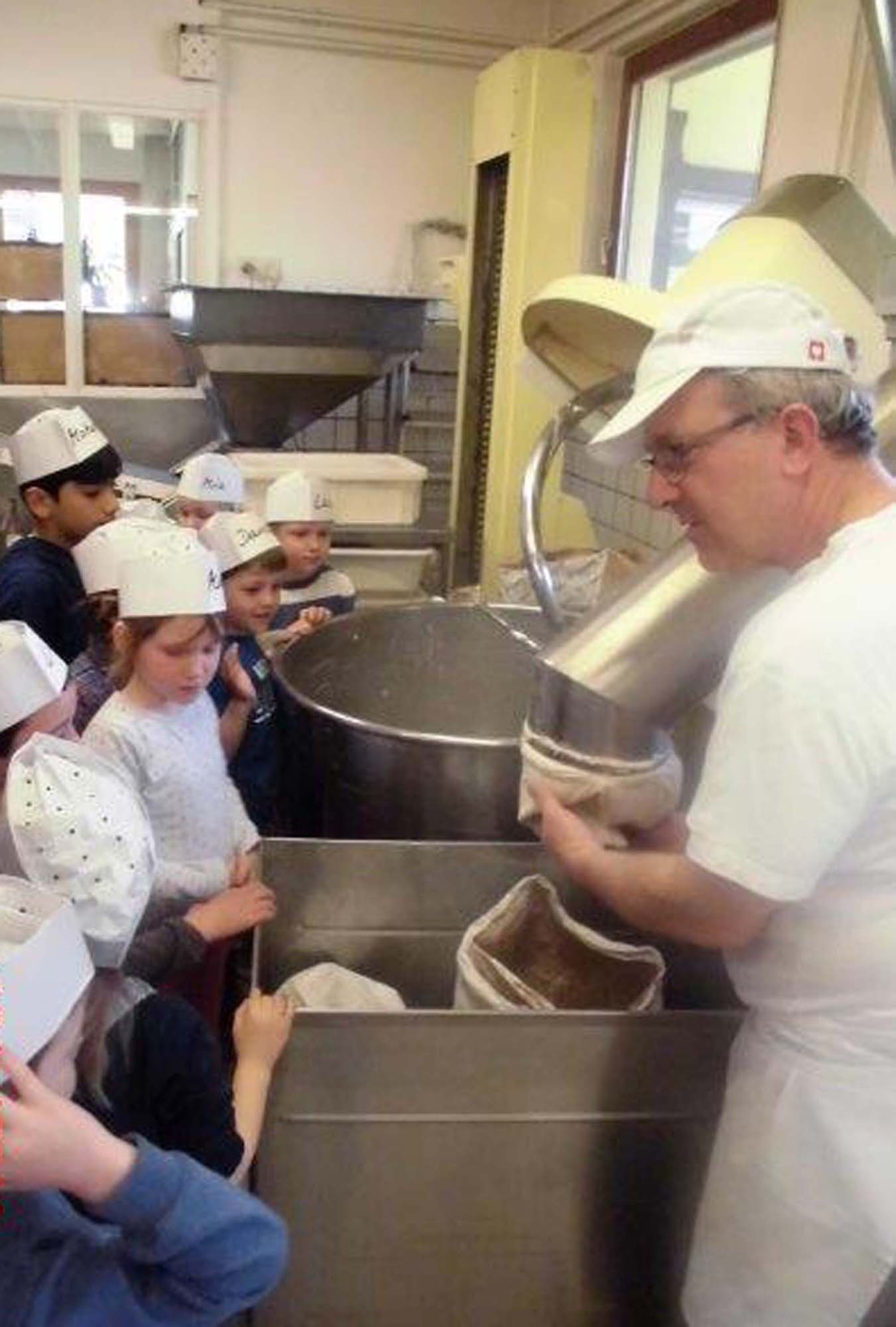 Danach begutachteten die Kinder fasziniert den begehbaren Backofen. Während die kleinen Kunstwerke nun gebacken wurden, erklärte Franz Lehmann die weiteren Maschinen und Geräte in seiner Backstube. Die Kinder staunten nicht schlecht über die riesigen Teigschüsseln, den großen Knethaken und dass das Mehl aus dem Silo wie durch eine »Röhrenrutschbahn« direkt in die Rührschüssel rutschte. Eine Maschine drückte einen großen Teigklumpen platt, wackelte ein wenig hin und her und schwups hatte sie den Teig in viele gleichgroße handliche Portionen unterteilt. Das Interesse und die Begeisterung der Kinder waren groß. Mit großen Augen schauten sie Franz Lehmann zu, als er demonstrierte wie man Teig schnell und geschickt in Brezeln, Zöpfe, Igel, Mäuse und sogar in ein Krokodil verwandeln kann. Inzwischen lag herrlicher Plätzchenduft in der Luft. Als Dank sangen die Kinder spontan das umgedichtete Lied: In der »Frühlingsbäckerei« gibt’s so manche Leckerei…