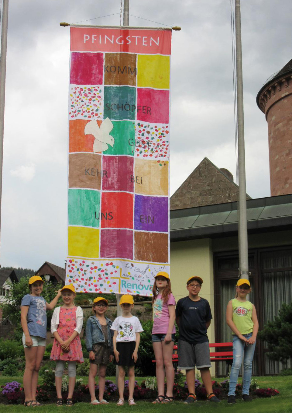 Pfingsten ist das Hochfest des Heiligen Geistes. Um diesem Fest eine besondere Würdigung zu verleihen, haben sich elf Kinder der Grundschule Oberharmersbach an zwei Nachmittagen im Pfarrzentrum getroffen, um gemeinsam eine neue Pfingstfahne zu gestalten und zu malen. Mit viel Freude und Ausdauer haben sie die Farben gemischt, die Fahne bemalt und dann den Schriftzug angebracht. Das Hausmeisterehepaar Ludwig und Hedwig Lehmann hat die Fahne zur Freude der Gottesdienstbesucher schließlich aufgehängt.