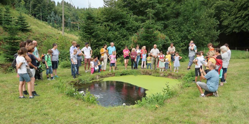 Eingeladen waren sie vom Familiengottesdienstteam. Ziel war die Wendelinuskapelle der Familie Volk in den Waldhäusern. Selbstverständlich wurde auch die Geschichte des Heiligen und Schutzpatrons der Landwirte im Gottesdienst erzählt. Doch zunächst wurde singend und betend der Gottesdienst eröffnet, danach machte sich die frohe Schar auf den Weg zur ersten Station, die der Farbe Grün gewidmet war. An einer Weide voll grasender Kühe, wurde Gott für Gräser, Kräuter und Bäume gedankt, weiter ging es zum Hof von Bernhard Wehrle. Freudig wurden alle von den quiekenden Schweinen im Stall begrüßt, das neugeborene Kälbchen wurde gestreichelt und anschließend voll Begeisterung die gelegten Eier der Hühner eingesammelt. Eindrücklich erzählte der Landwirt von seiner Arbeit, die er jeden Tag unter Gottes Segen stellt. Am Biotop der Familie Kubasek wurde zunächst nach den kleinen Fröschen Ausschau gehalten, dann dankten alle Gott für das Blau des Wassers und des Himmels – das Lied »Alle meine Quellen entspringen in Dir« wurde vom Plätschern und Rauschen des Wassers untermalt. Am Hofkreuz, ein paar Schritte weiter stand die Farbe Gelb im Mittelpunkt. Gott hat uns die Sonne geschenkt, ohne das Licht und ihre wärmenden Strahlen können wir nicht leben und auf ging es zur letzten Etappe. Platz ist auch in der kleinsten Kapelle, dass bewiesen die Gottesdienstbesucher, die eng zusammenrückten, um auch an der letzten Station zu beten. Sie war der Farbe Rot, der Liebe gewidmet. »Gottes Liebe ist so wunderbar« schallte vielstimmig aus der geschichtsträchtigen Kapelle im Waldhäusertal.