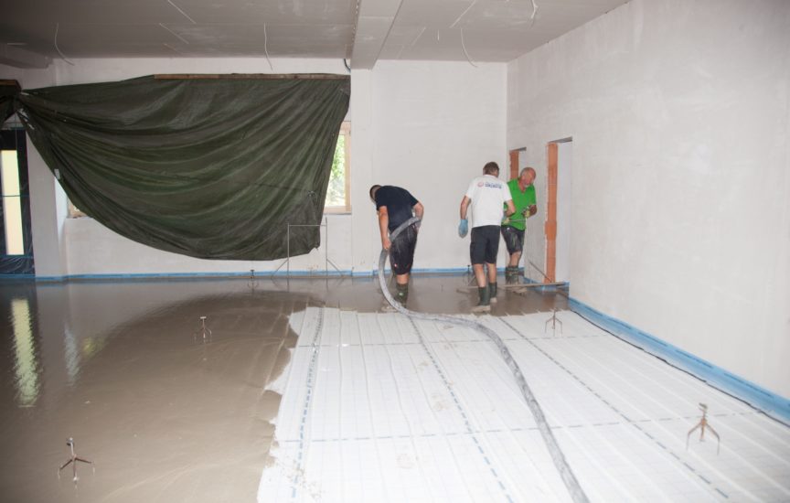 Nach der Verlegung der Fußbodenheizung wurden auf den rund 550 Quadratmeter der künftigen Räumlichkeiten für die Freiwillige Feuerwehr Oberharmersbach rund 65 Tonnen Anhydrit Fließestrich eingebaut. Während nunmehr im Gebäude die weiteren Arbeiten laufen, sind im Außenbereich erste Formen der späteren Gestaltung zu erkennen. Bis Anfang Oktober soll dieser Bereich fertiggestellt sein.