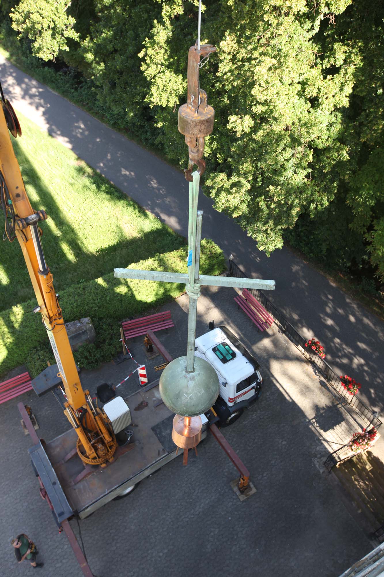Auf nahezu 30 Meter musste Gerd Rombach den Fahrzeugkran der Firma Rombach ausfahren. Langsam schwebte die Last auf Turmhöhe, Schrauben gaben Zierkugel und Kreuz den erforderlichen Halt. Damit hat der Turm der Zuwälder »Maria-Hilf-Kapelle« wieder seine Höhe von knapp über 30 Meter erreicht. Mit den Blechnerarbeiten findet die Sanierung des Turmhelms demnächst ihren Abschluss.