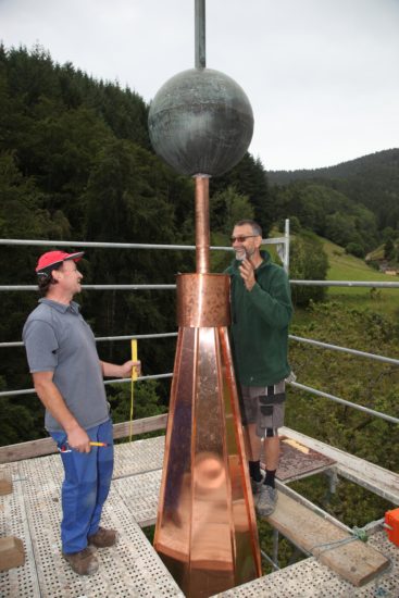 Unser Bild zeigt Konrad Ruf (links) und Bernd Rappenecker bei den Abschlussarbeiten in 28 Meter Höhe.
