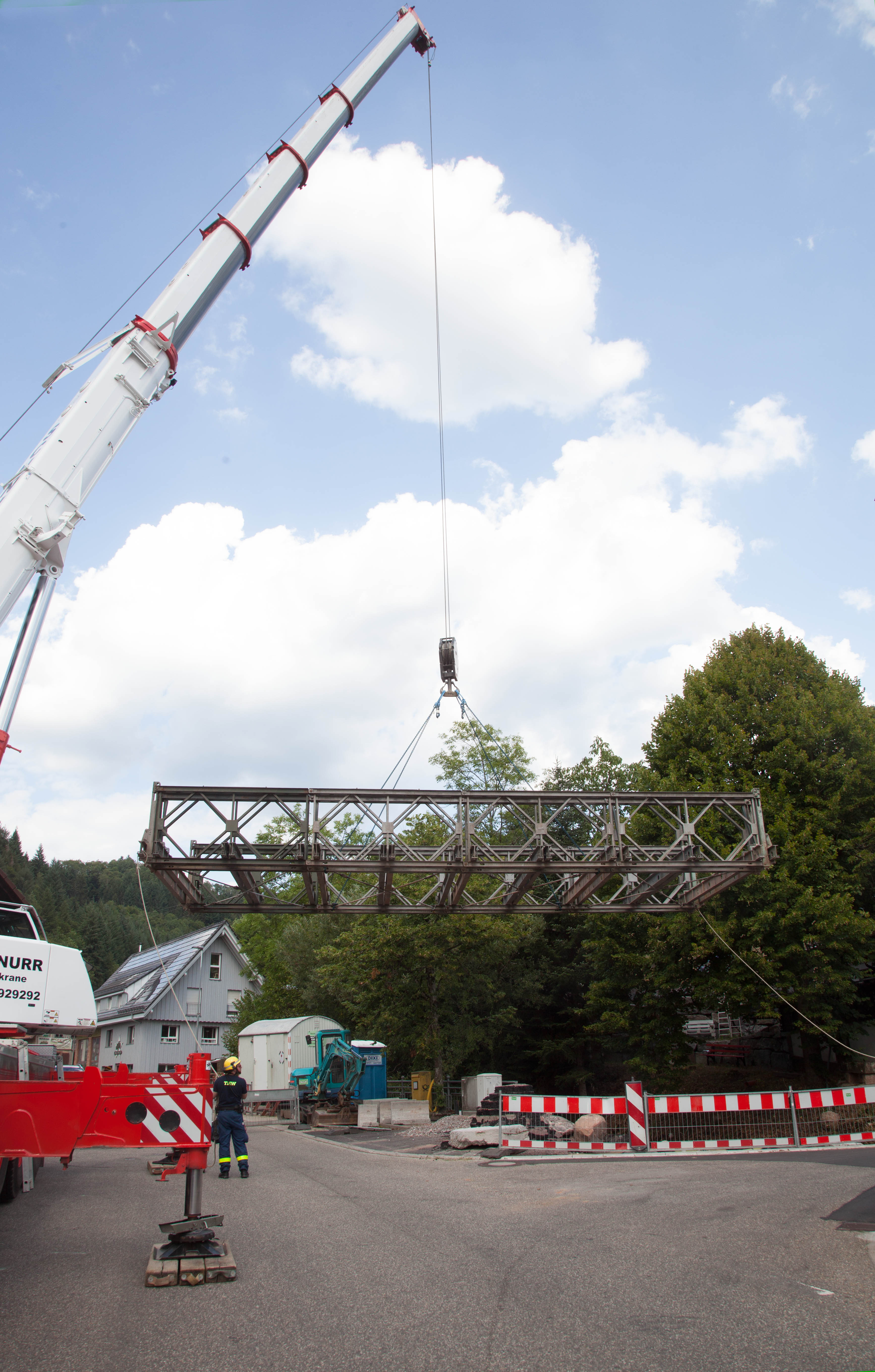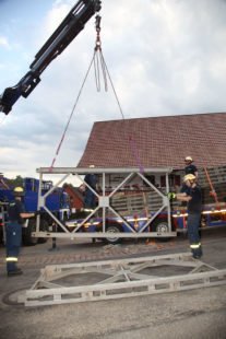 Jetzt war das THW zum dritten Mal gefragt. Das Procedere war vorgegeben. Unterstützt vom Autokran der Firma Schnurr, liefen am Freitagnachmittag um 15 Uhr die Vorbereitungen an. Während Wolfgang Schnurr und Dirk Ballin den Kran für den Einsatz vorbereiteten, verteilte Zugführer Marc Wiencke sein Team auf die einzelnen Positionen. 14 Männer und eine Frau aus Müllheim, Kehl und Biberach, räumten Gegenstände aus dem Weg und platzierten die vier Ketten, um das 13 Tonnen schwere Stahlgerüst aus den Widerlagern zum Platz jenseits der Talstraße am Eingang des Jauschbachtales zu hieven, wo die »Bailey-Brücke« wieder zerlegt wurde.