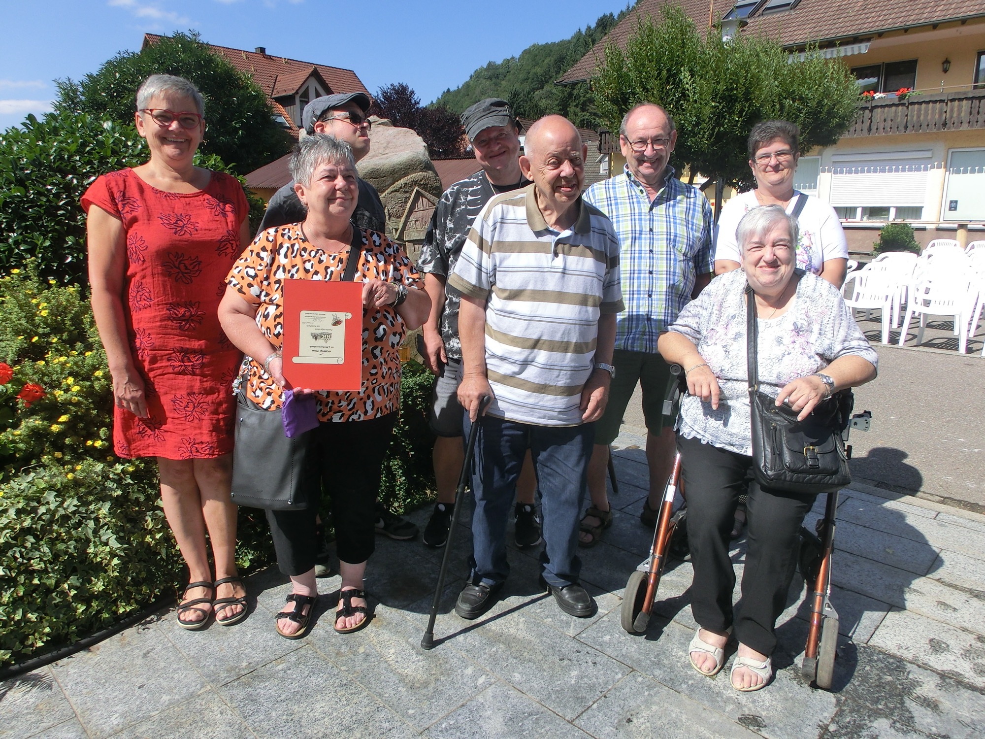 Doch zuvor traf man sich bei herrlichem Sommerwetter im »Vesperhäusle« vor der Tourist-Info in Oberharmersbach. Sonja Wurth, 3. Stellvertreterin des Bürgermeisters und früher selbst Gastgeberin im Ort, überbrachte die Glückwünsche der Gemeinde in Form von einer kleinen Urkunde und feinen Spirituosen heimischer Brennereien.