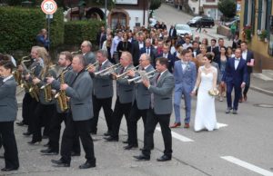 So war es für das Orchester eine Selbstverständlichkeit, ihrer Flötistin Patricia Schmieder und ihrem Mann Dominik Himmelsbach aus Welschensteinach am Samstagmittag die entsprechende Aufwartung zu machen. Michael Gutmann führte als Dirigent der Miliz- und Trachtenkapelle den Hochzeitszug von der Paulimühle durch das Dorf zur Pfarrkirche St. Gallus an. Den Gottesdienst, den Pfarrer Peter Seibt zelebrierte, umrahmten Musiker der Miliz- und Trachtenkapelle.