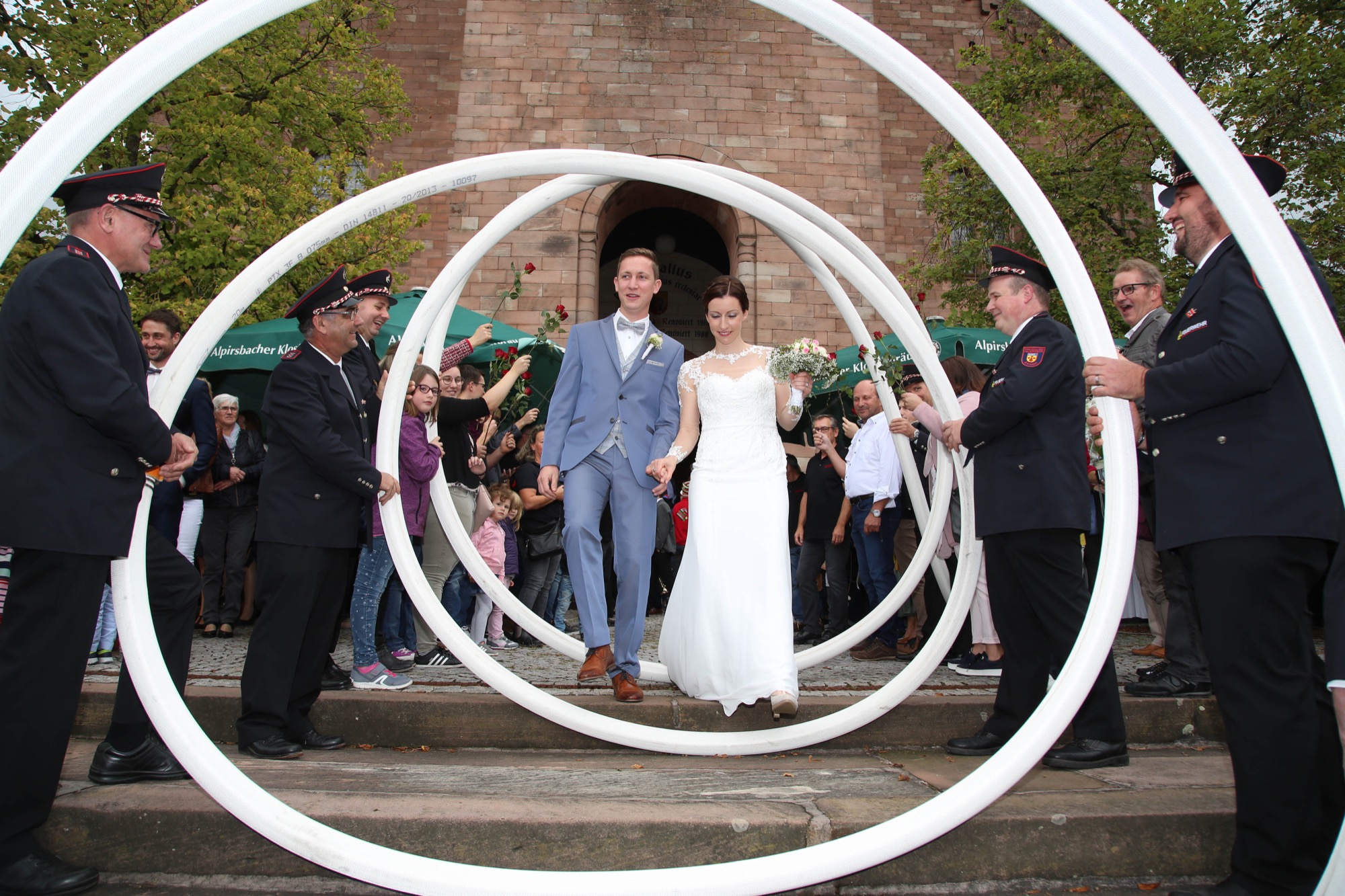 Die Gratulationsgasse der Feuerwehr Welschensteinach schritt das Brautpaar gerne ab. Foto: Karl-August-Lehmann