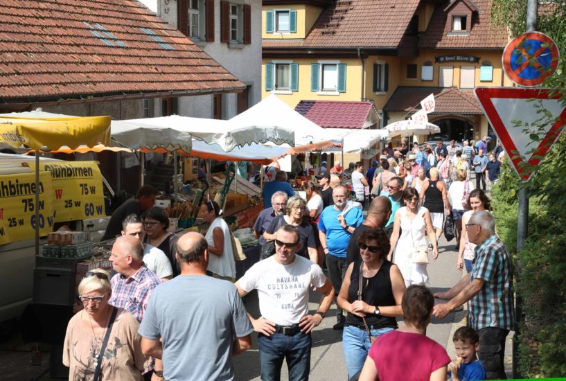 Schon in den frühen Morgenstunden bauten die Marktbeschicker auf den ihnen zugewiesenen Plätzen ihre Stände auf. Wenn auch im Vergleich zu früheren Jahren die eine oder andere Lücke sich aufgetan hat, so war das Angebot der über 80 Händler immer noch vielfältig. Vom Ledergürtel über T-Shirts und Socken, Tischdecken, Bürsten und Messbecher, Spielwaren und Schmuck bis zum Gemüsehobel und anspruchsvollen Küchenmesser reichte die bunte Palette der ausgelegten Waren. Selbst im Zeitalter des Online-Handels scheint der Treff auf dem Markt für viele unentbehrlich zu sein: das Vorführen der Ware, das beratende Gespräch und eben einfach ein Schwätzchen zur Abwechslung.