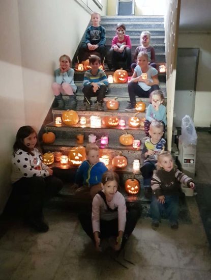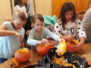Dreizehn Junghästräger im Alter von 2 bis 11 Jahren folgten dieser Einladung und bastelten mit großer Freude schaurig-schöne Herbstdeko: es wurde gelöffelt, geschnitzt, geschnitten, geklebt und dekoriert. Am Ende entstanden zahlreiche gruselige oder lustige Kürbisgesichter sowie Mumien und Vogelscheuchen als bunte Windlichter, die mit Einbruch der Dunkelheit das Treppenhaus des Rathauses zum Leuchten brachten.